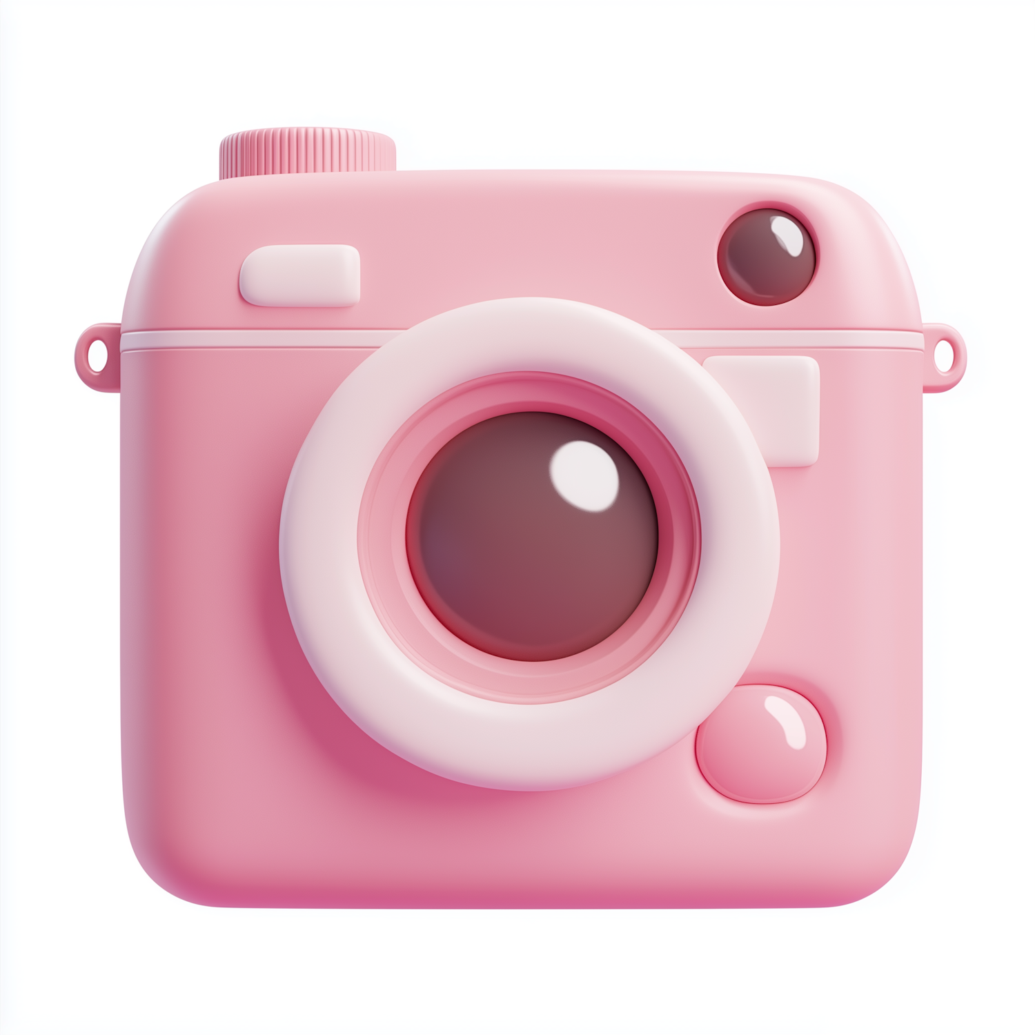 Cute 3D pink camera illustration with a modern design, featuring a large lens and playful buttons. Perfect for creative projects.