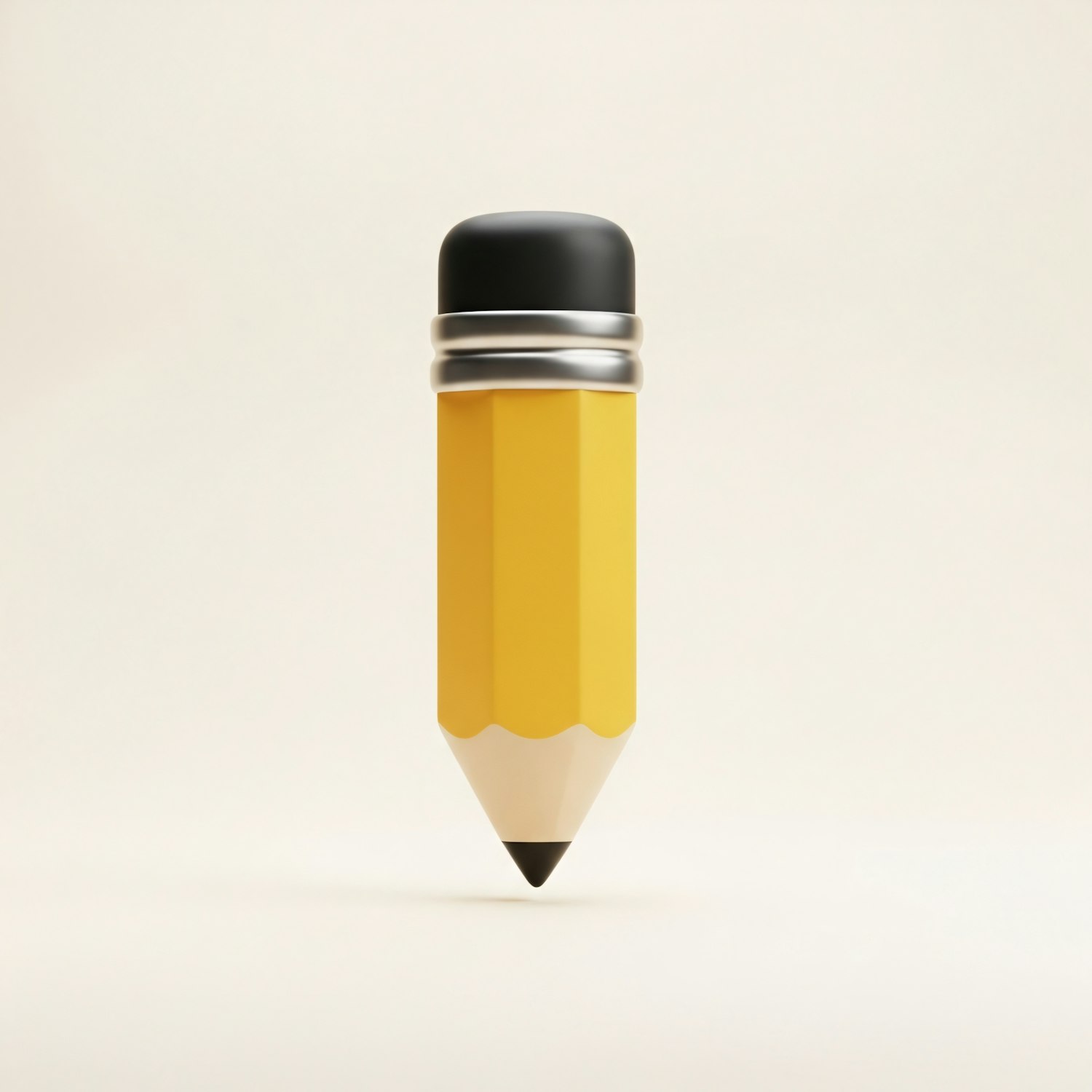 A minimalistic 3D rendering of a yellow pencil with a black eraser and metallic ferrule, set against a neutral background.