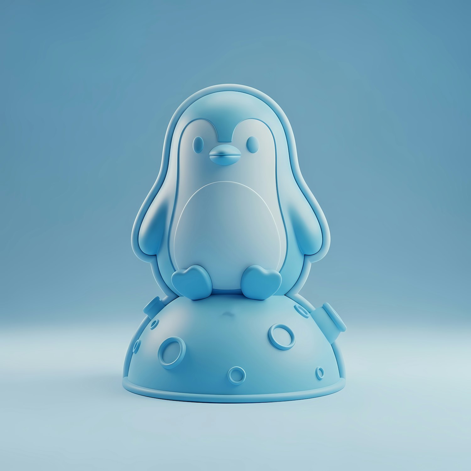 Adorable 3D blue penguin sitting on a moon-like base, perfect for playful and minimalistic design lovers.