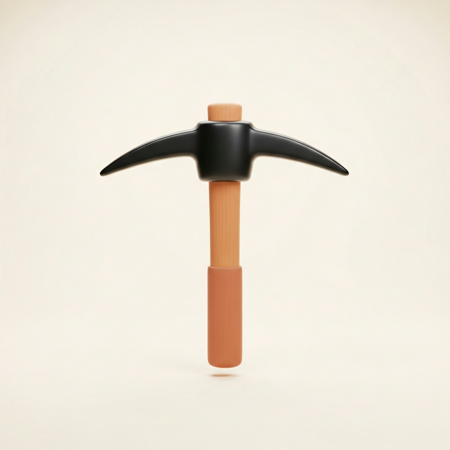 A 3D-rendered pickaxe with a wooden handle and black head, displayed on a neutral background, showcasing its design.