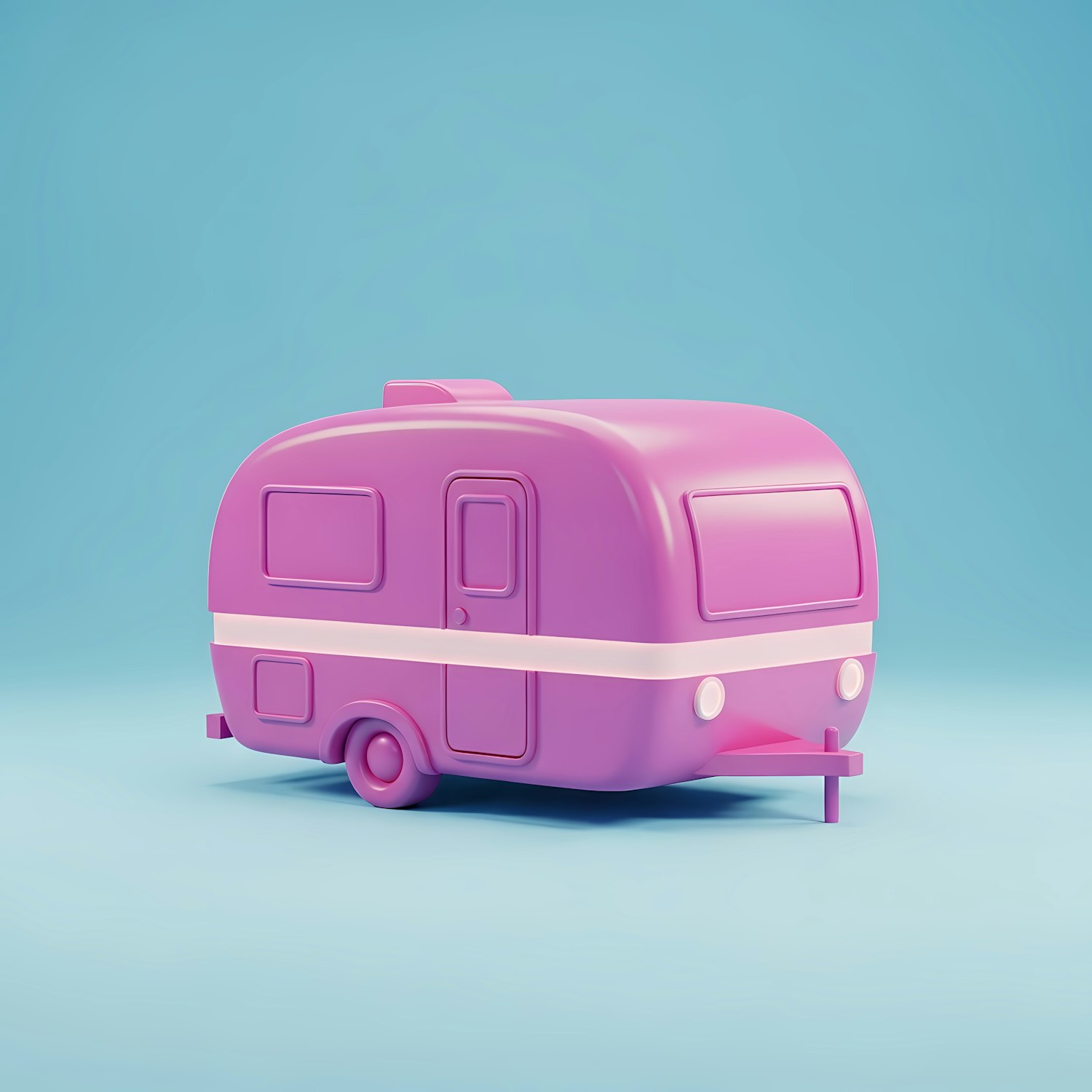 A vibrant pink retro-style caravan with a white stripe, set against a clean light blue background. Perfect for modern design inspiration.