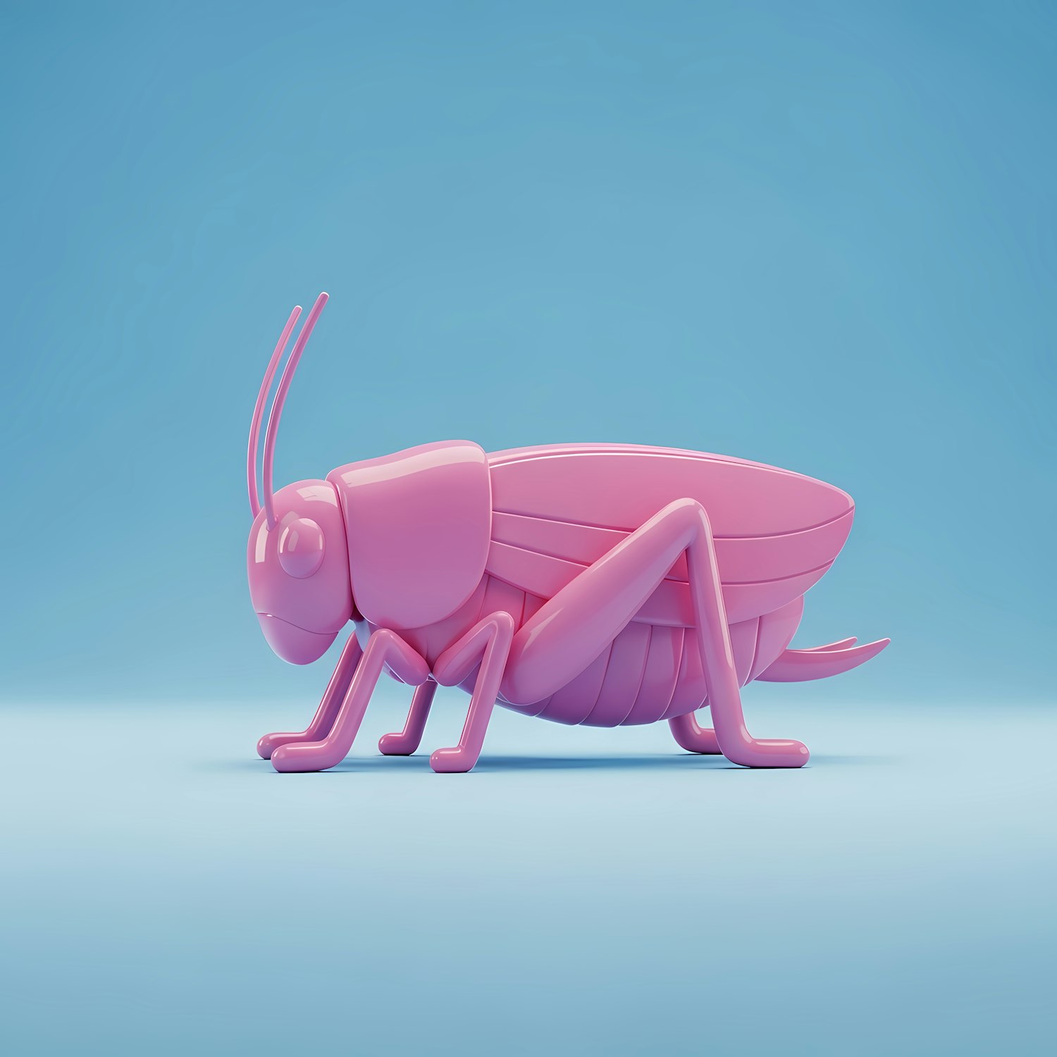 A vibrant 3D pink cricket model on a blue background, showcasing a modern and artistic design with a glossy finish.