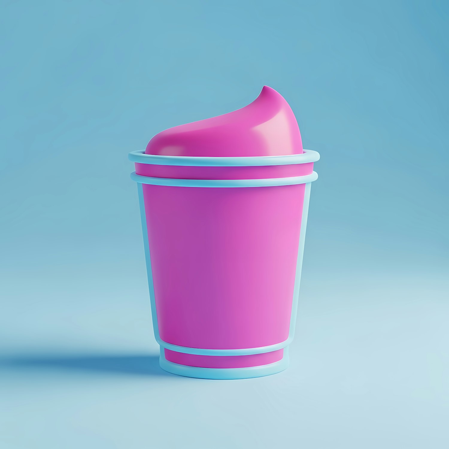 Bright 3D illustration of a pink cup with a blue rim and a swirl top, set against a light blue background. Fun and colorful design!