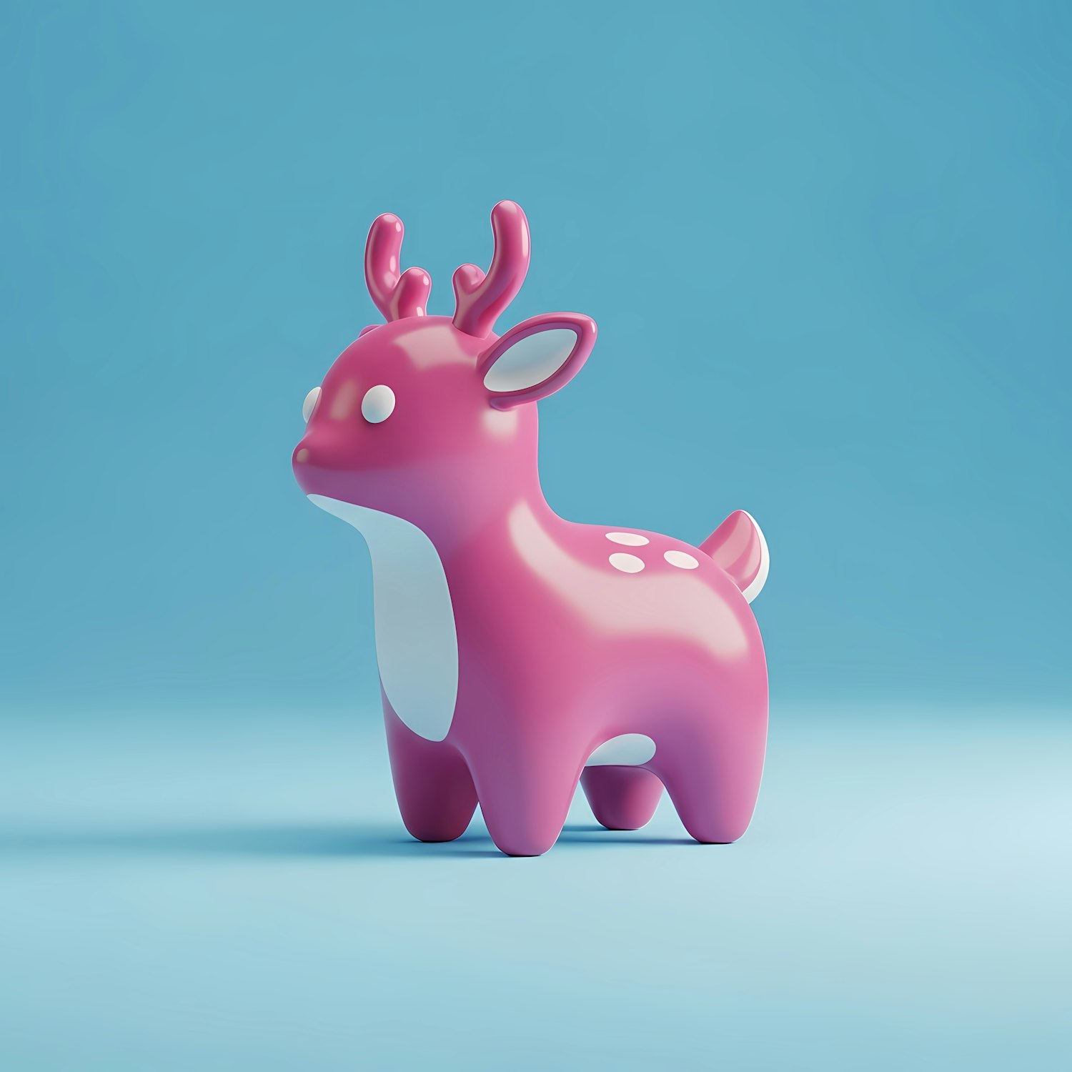 Adorable 3D pink deer figure with white spots and a glossy finish, set against a soft blue background. Perfect for cute design inspiration.
