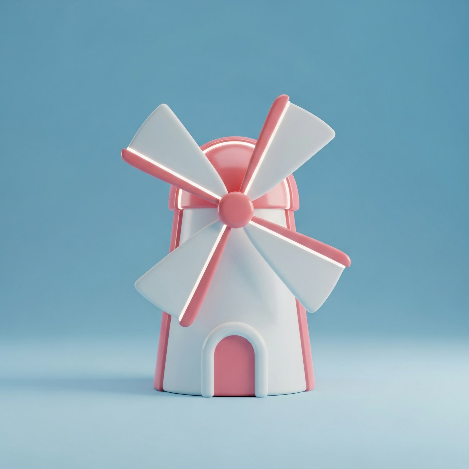 A minimalistic pink and white windmill with a glossy finish set against a solid blue background, showcasing a playful and modern design.