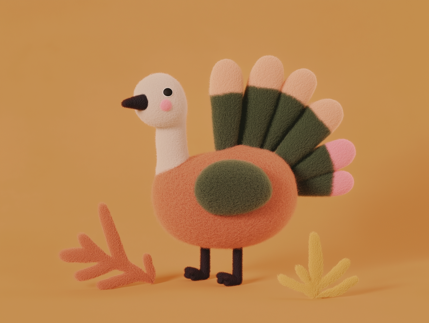 Charming plush-like turkey with colorful tail feathers on a warm orange background, surrounded by felt-like plants.