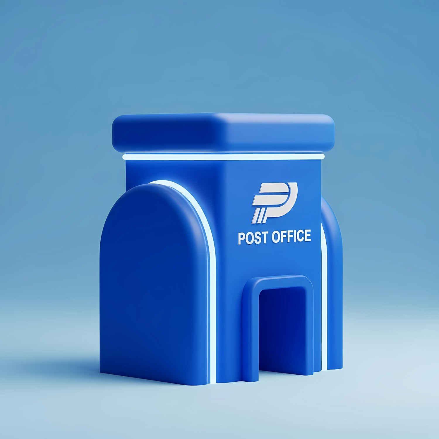 A modern 3D illustration of a blue post office building with a clean design and a light blue gradient background.