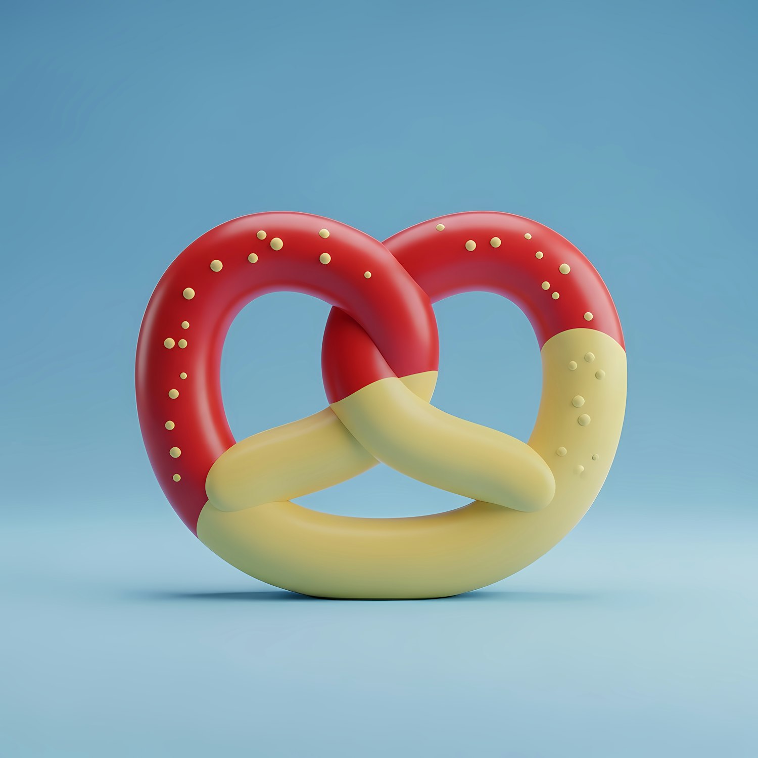 A colorful 3D-rendered pretzel with red and yellow sections, set against a light blue background. Fun and modern design!
