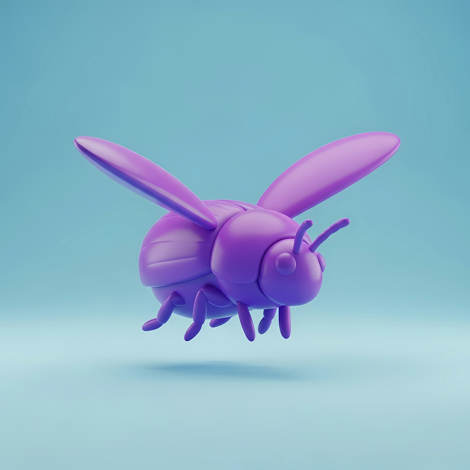 A 3D-rendered purple insect with smooth features, mid-flight against a gradient blue background, showcasing a vibrant and minimalistic design.