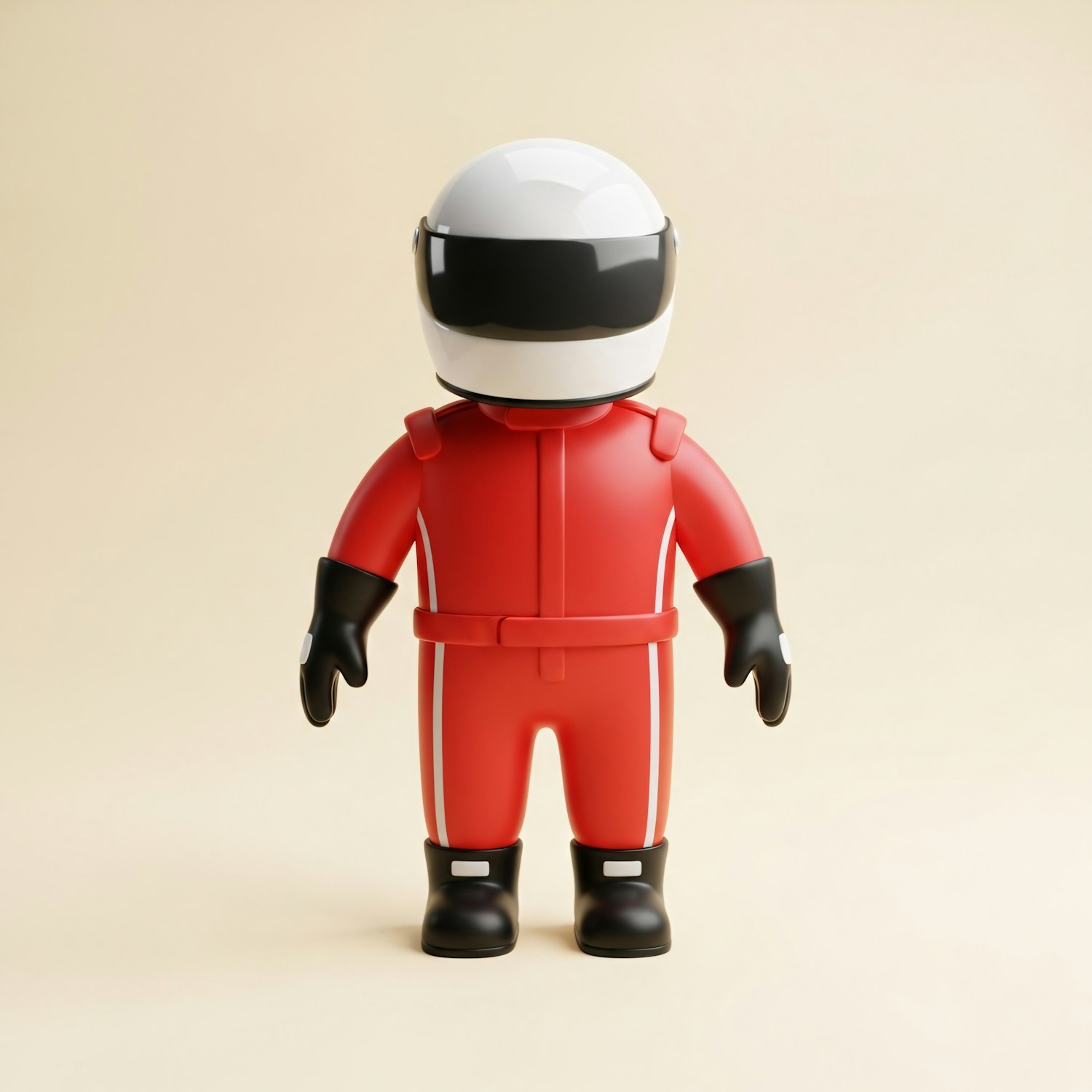 A 3D-rendered racer figure in a red suit and helmet, set against a beige background, showcasing a sleek and minimalistic design.