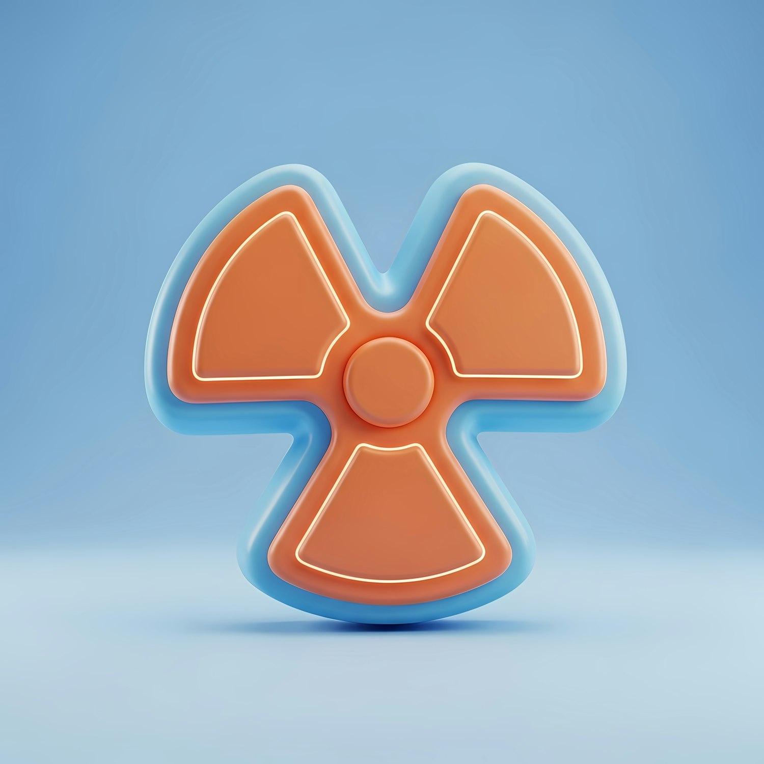 Stylized 3D radiation hazard symbol in orange and blue, with a smooth, modern design on a light blue background.