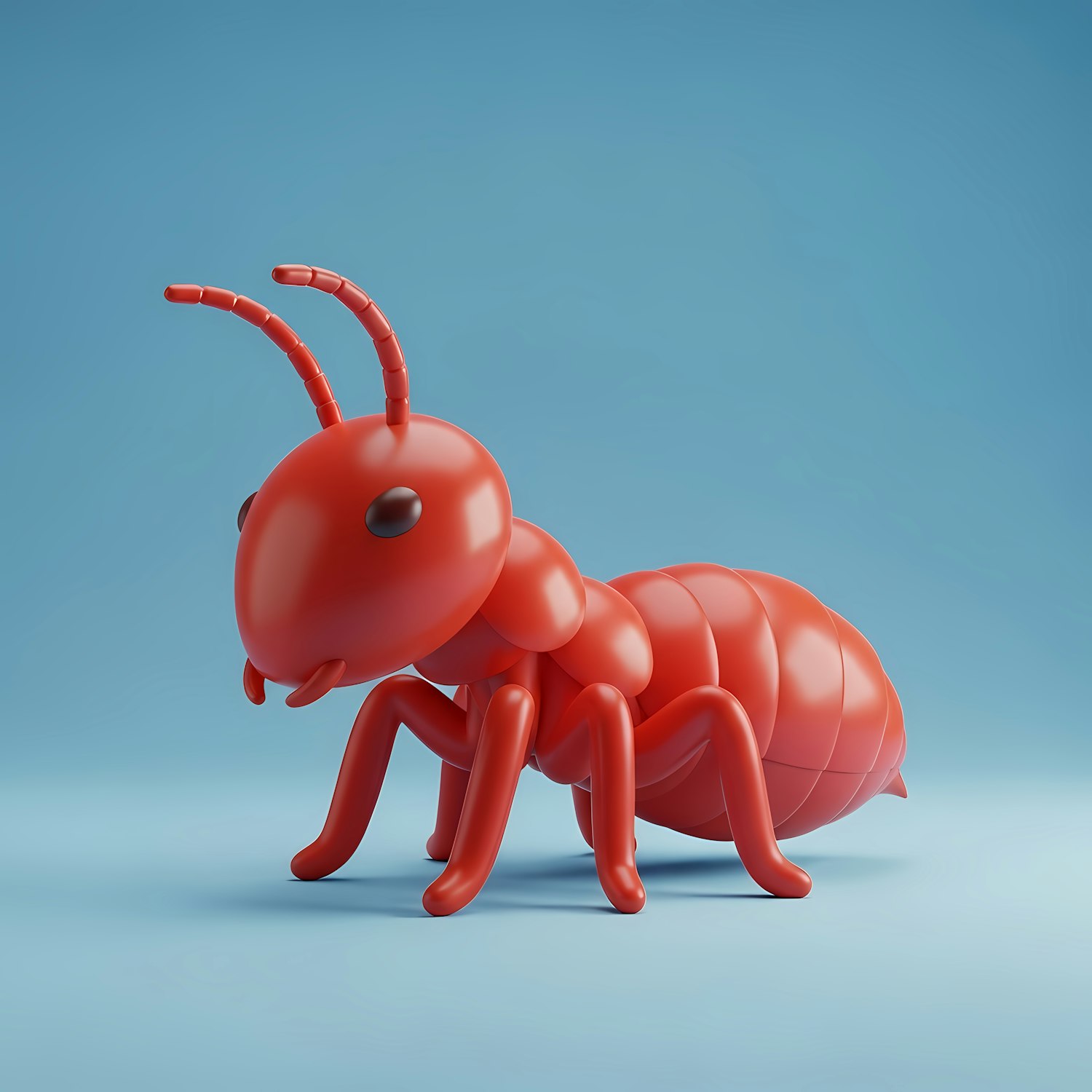 A vibrant 3D-rendered red ant with a glossy finish stands against a smooth blue background, showcasing a playful and stylized design.