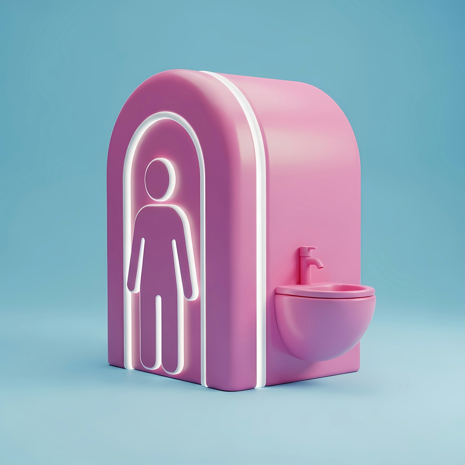 A modern 3D restroom sign in pink with a sink, set against a light blue background, showcasing a clean and minimalistic design.
