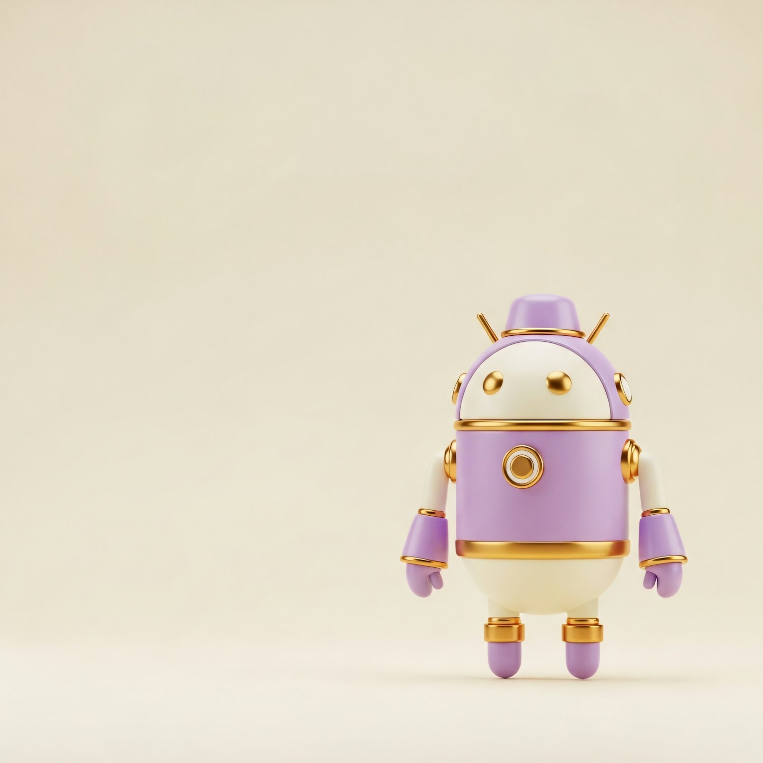 A cute lavender and gold robot with a small hat stands against a beige background, showcasing a sleek and whimsical design.