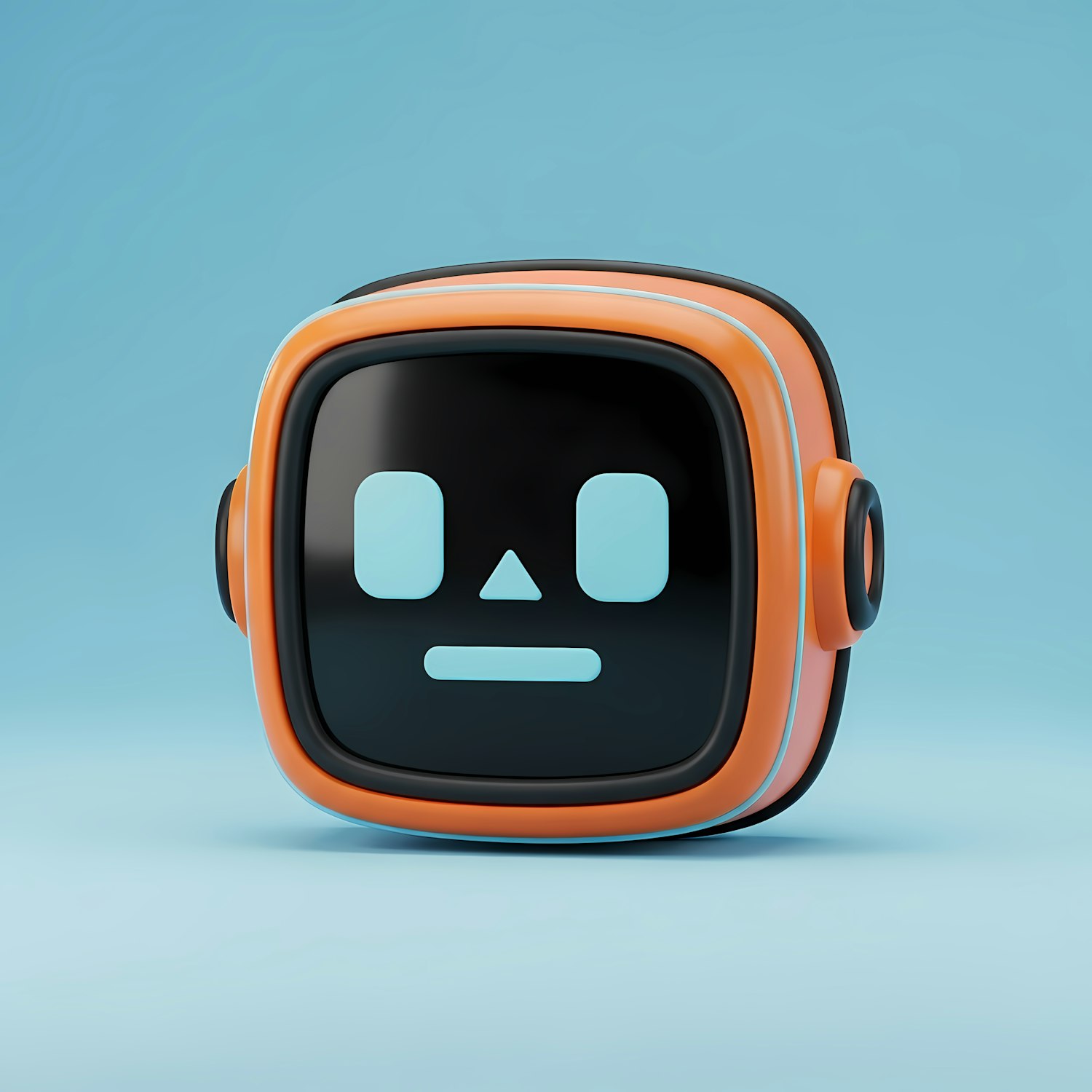 Cute 3D robot head with glowing blue features on a black faceplate, encased in orange, set against a light blue background.