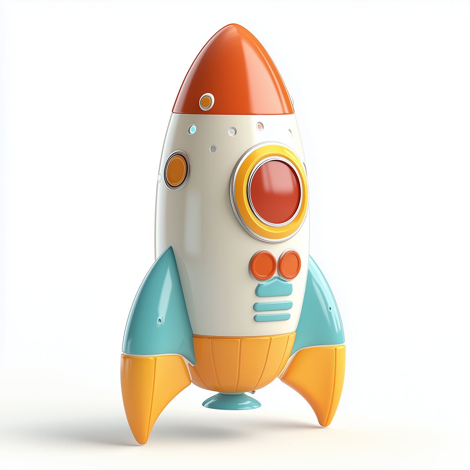 Colorful toy rocket with orange, teal, and cream design, featuring circular windows and buttons, set against a white background.