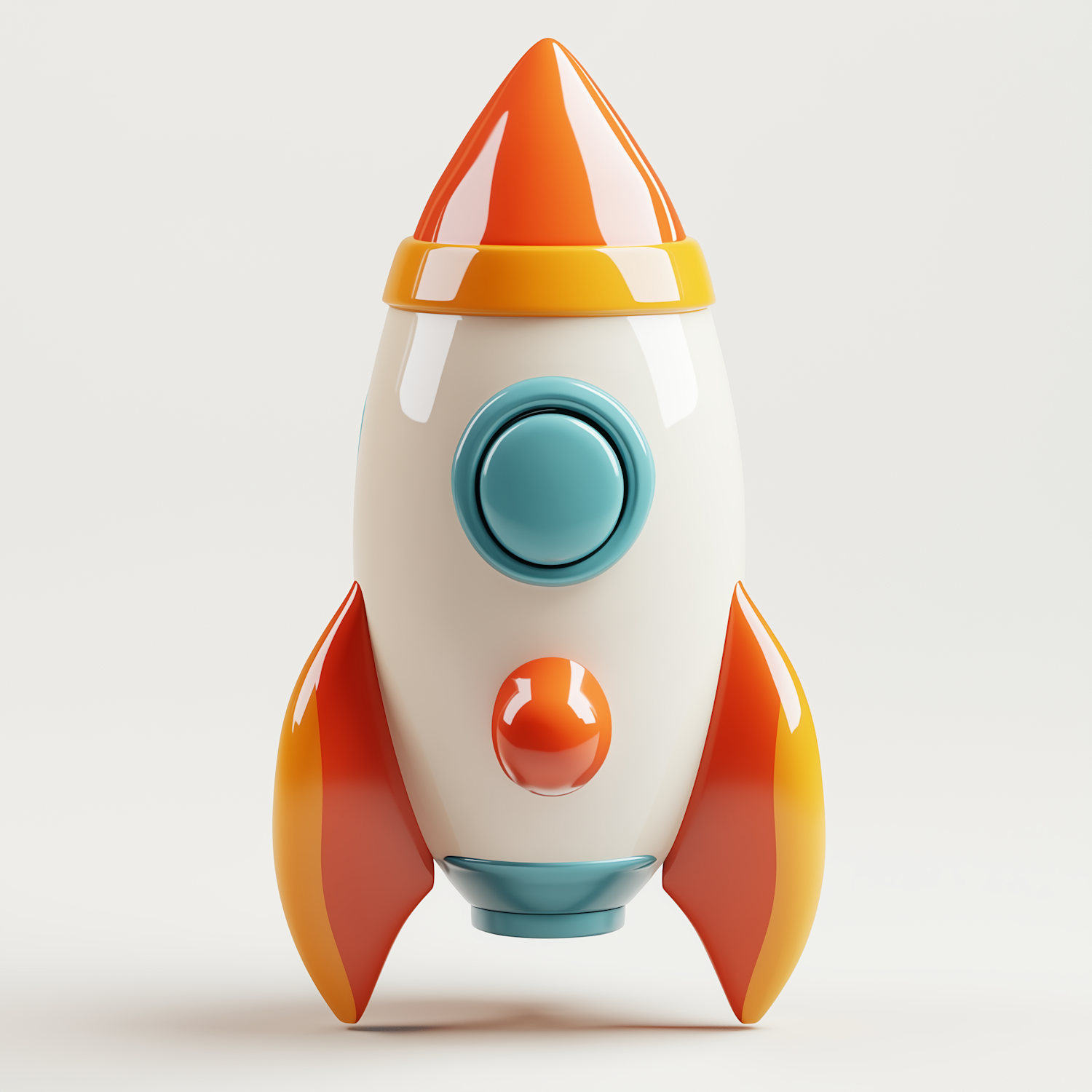 Vibrant toy rocket with orange, yellow, and blue accents, featuring a glossy finish and playful design against a plain background.