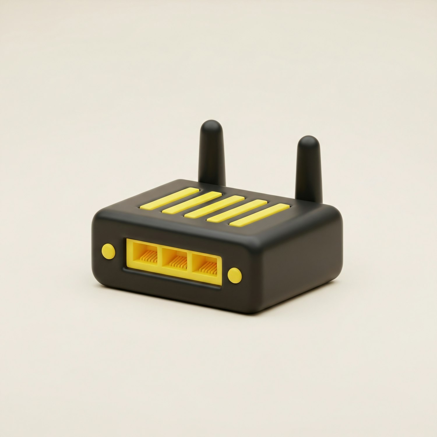 A sleek black and yellow router with two antennas, designed in a minimalist 3D style, perfect for tech-related visuals.