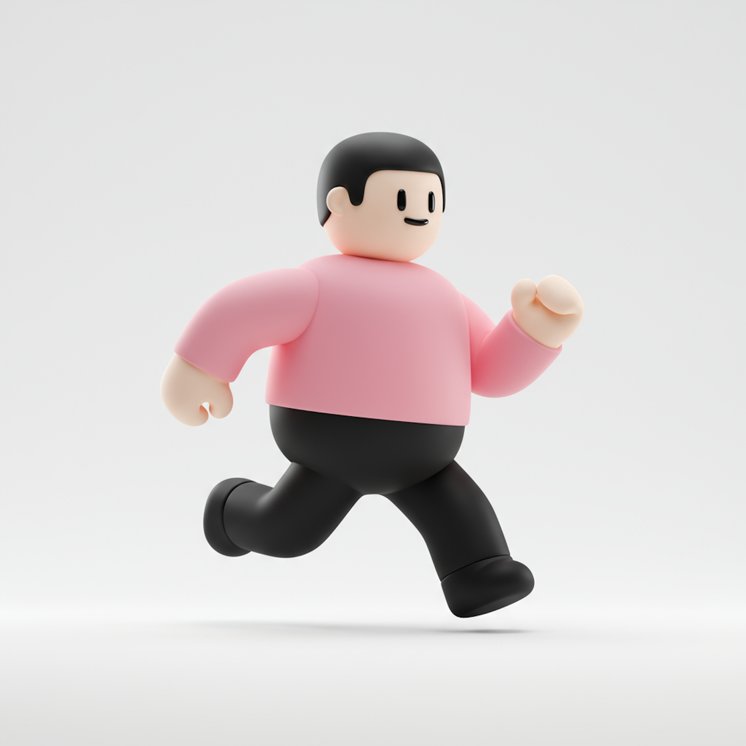 A cute 3D cartoon character in a pink shirt and black pants running on a white background. Perfect for playful or fitness themes.