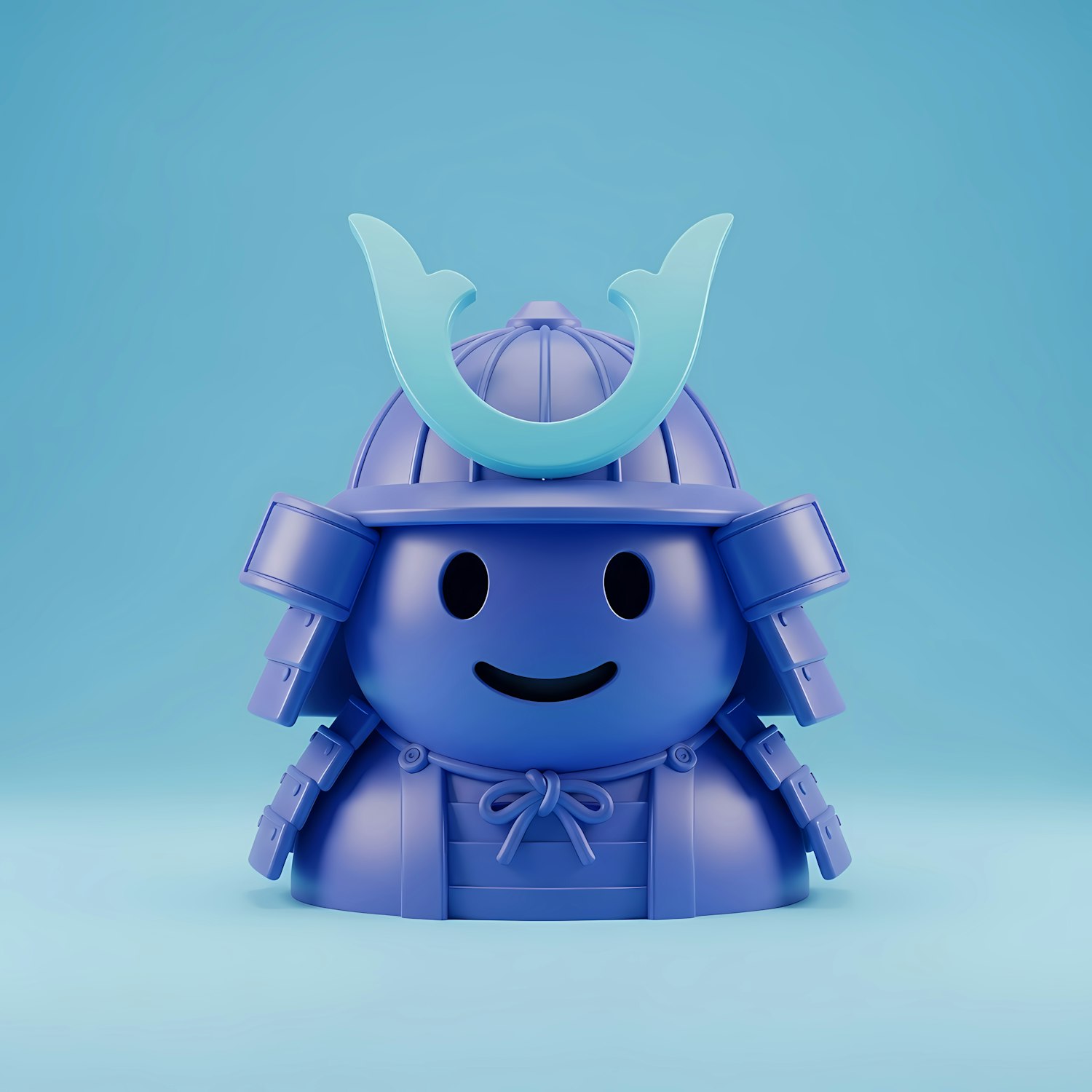 Adorable 3D samurai character in blue armor with a crescent crest, set against a light blue background. Perfect for playful designs.