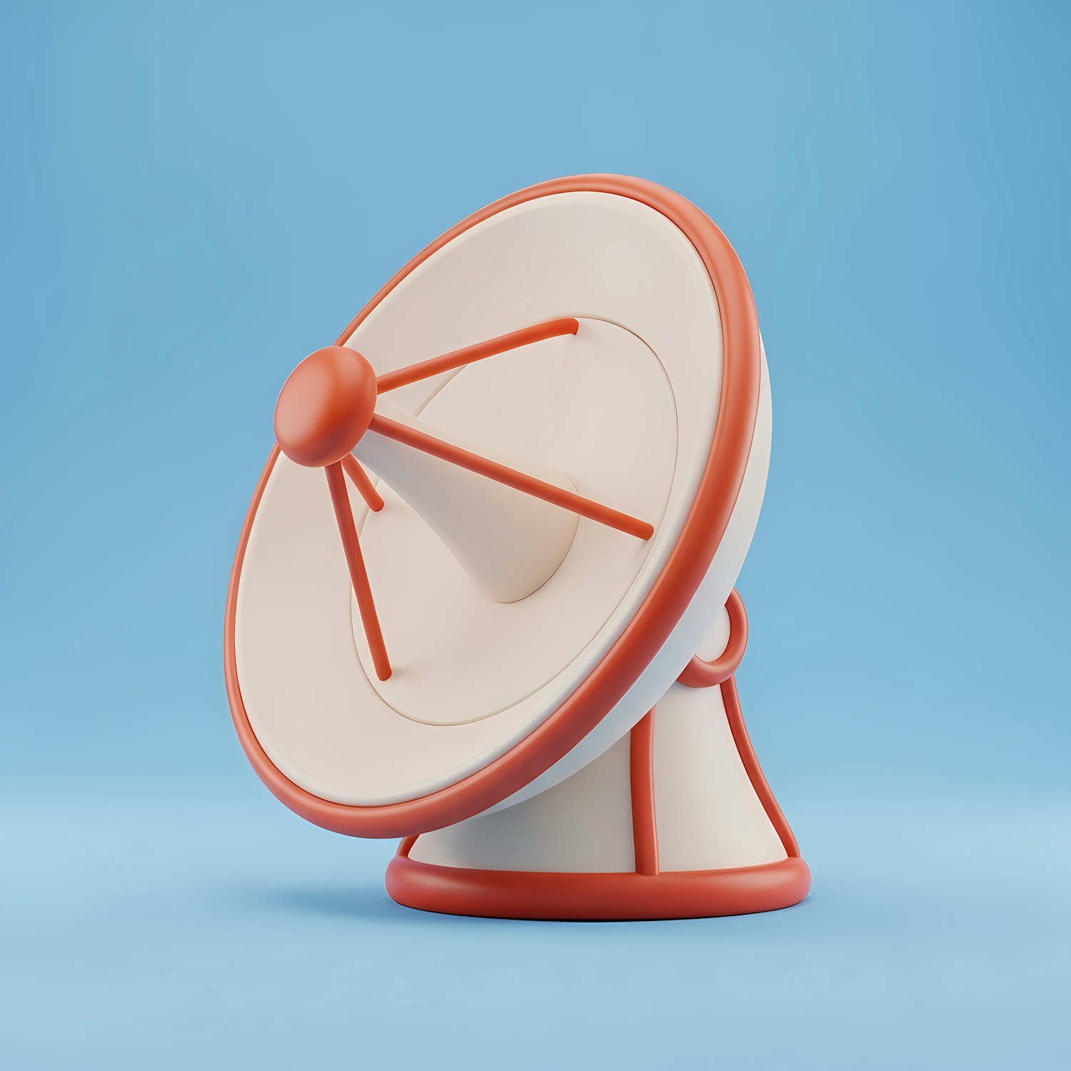 Stylized 3D satellite dish in white and orange against a clean blue background, perfect for tech or communication themes.