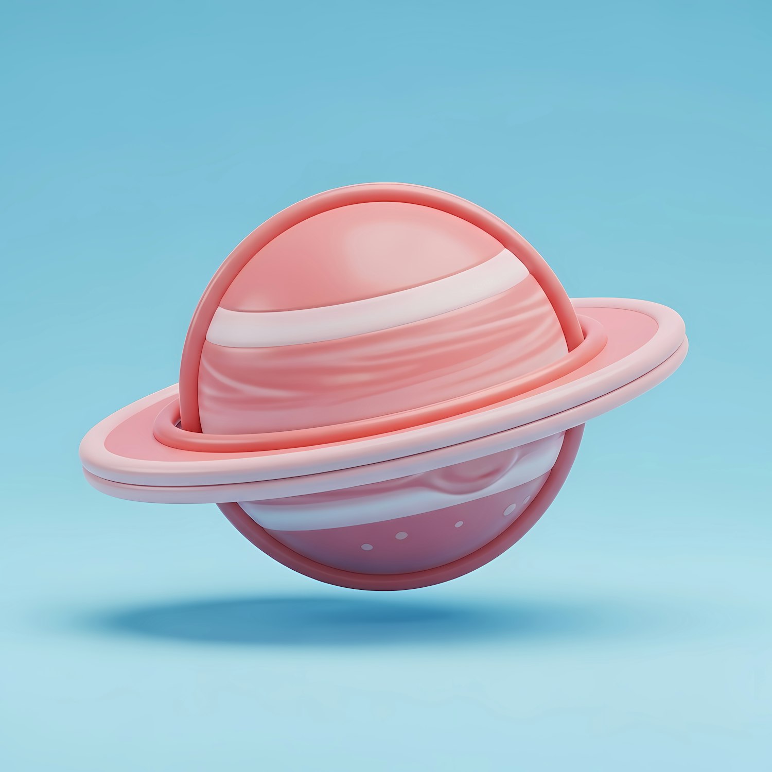 A pink and white 3D planet with rings against a light blue background, featuring a smooth and whimsical design.