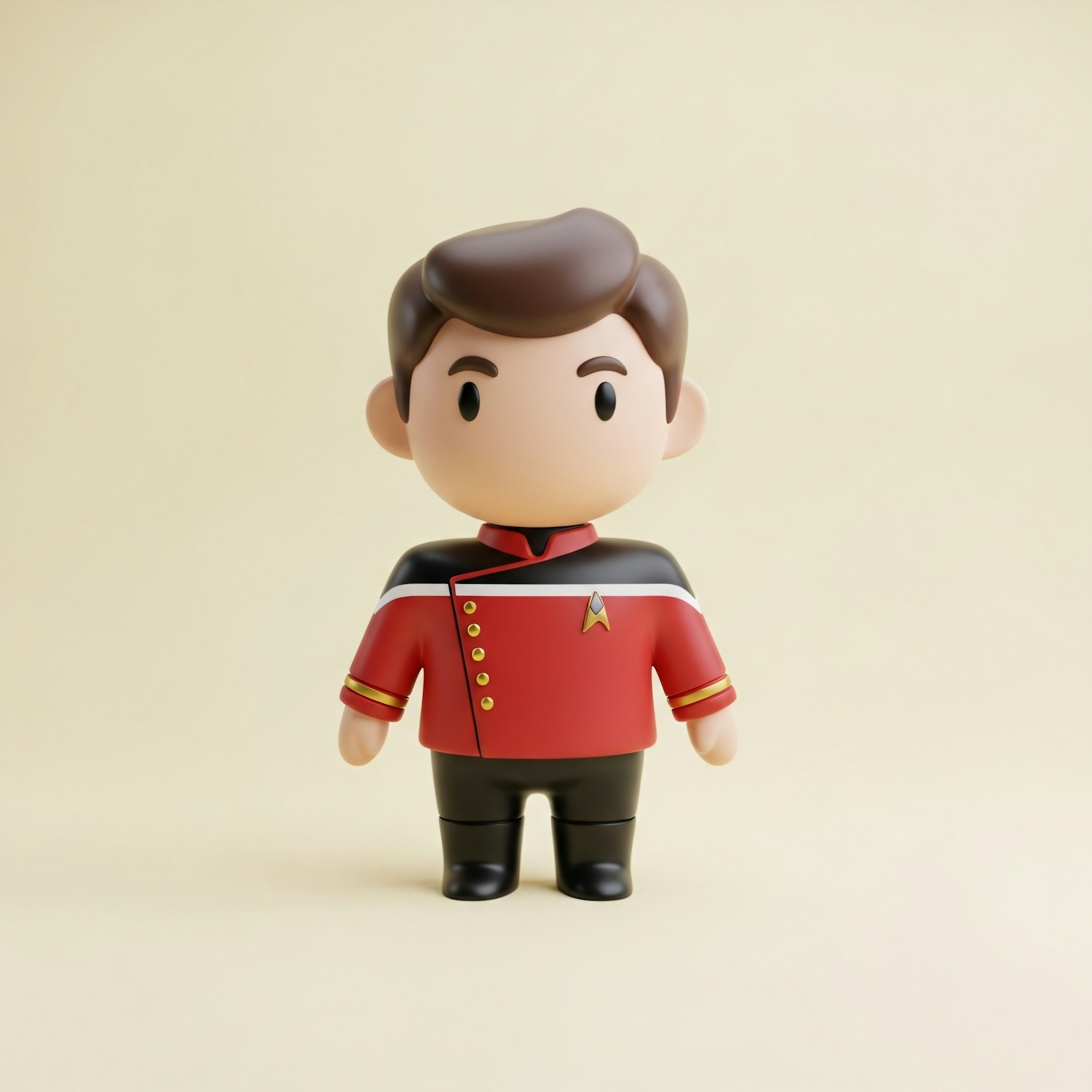 A cute cartoon figure in a red and black sci-fi uniform with gold accents, standing against a plain background.
