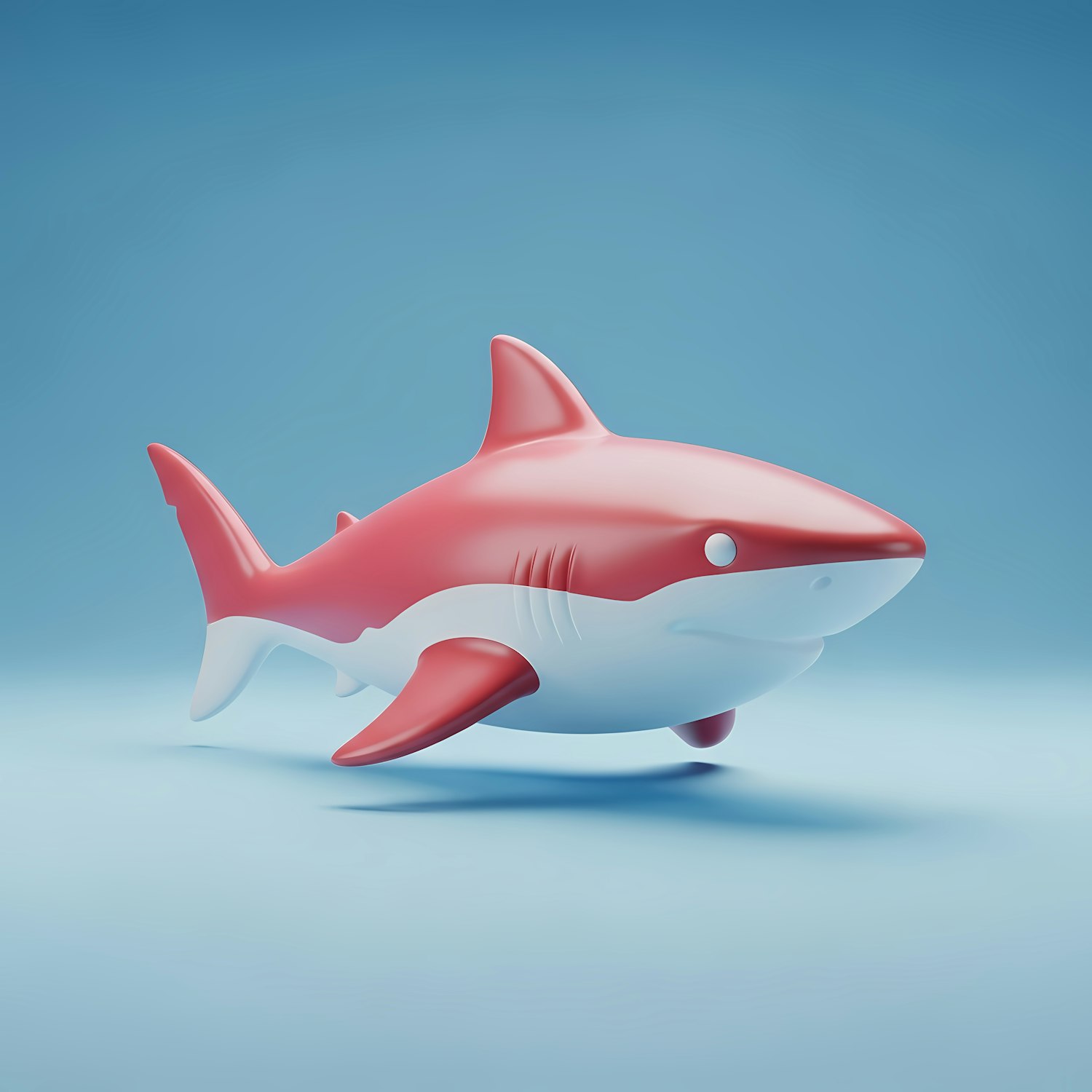 A vibrant 3D-rendered shark with a red and white design, set against a clean blue background, showcasing a playful and modern aesthetic.