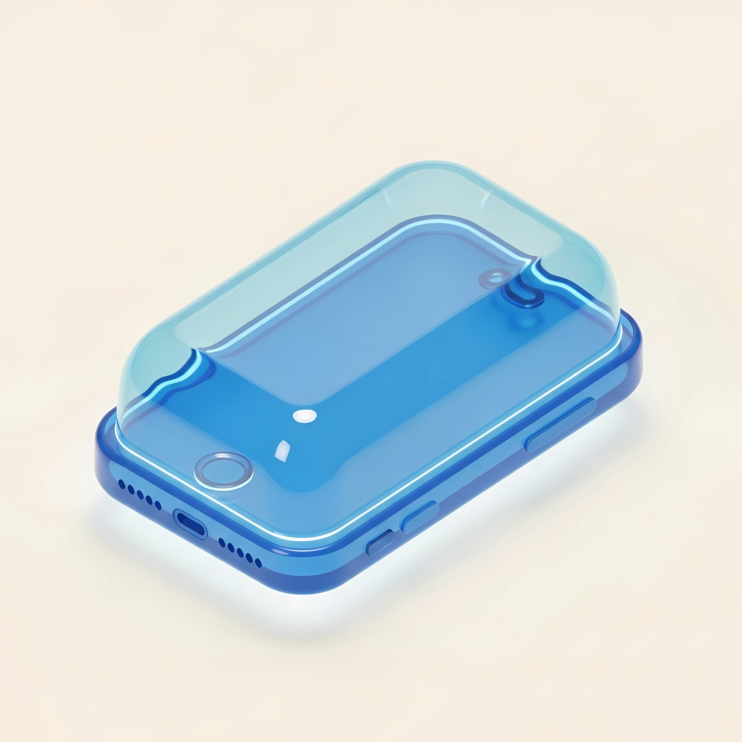 Stylized 3D illustration of a smartphone with a transparent blue case on a soft beige background, showcasing modern design.