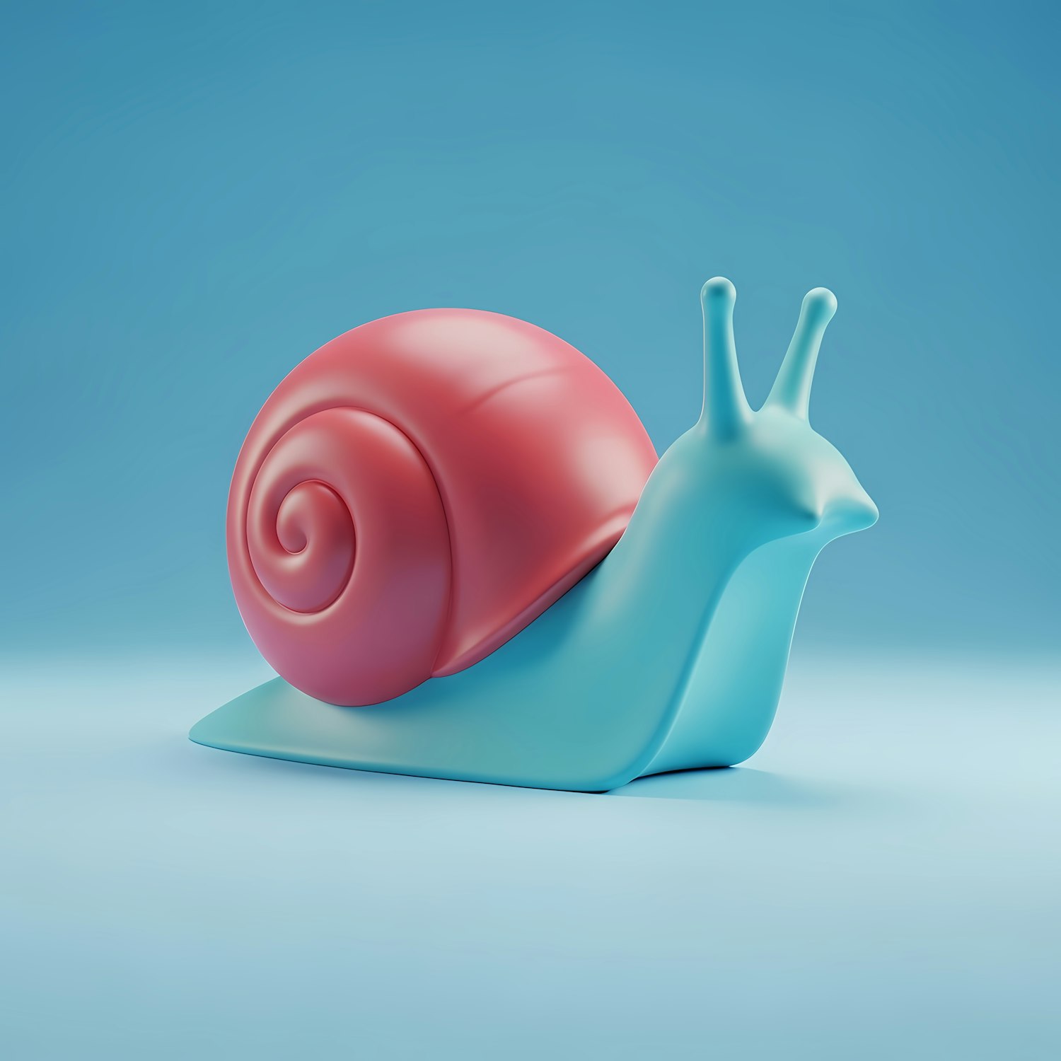 A vibrant 3D snail with a blue body and pink shell on a light blue background, showcasing a clean and modern design.