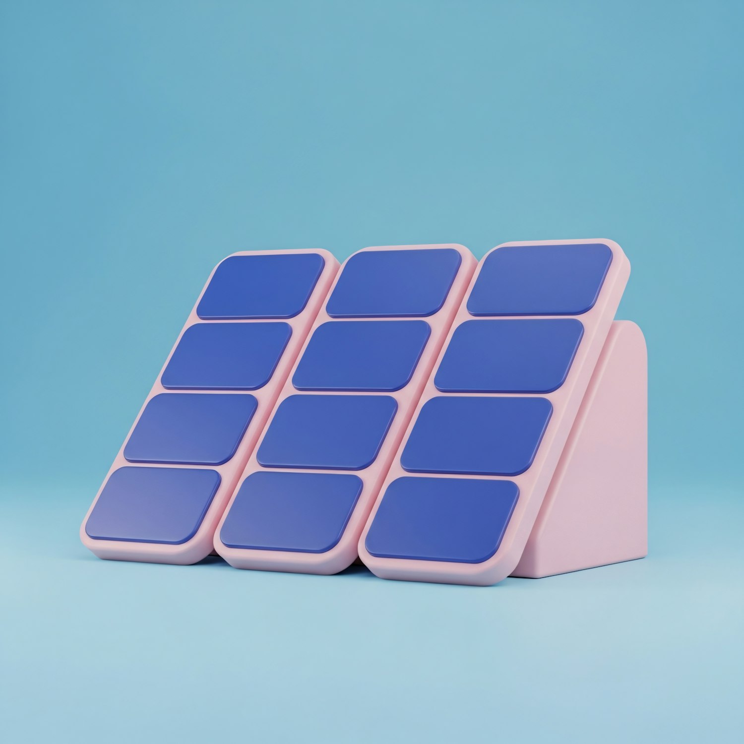 A modern, minimalistic solar panel design with blue modules and a pink frame against a light blue background.