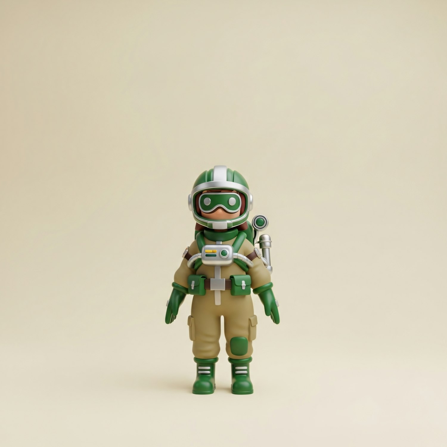 A stylized figure in a green and beige spacesuit with detailed accessories, set against a plain beige background.