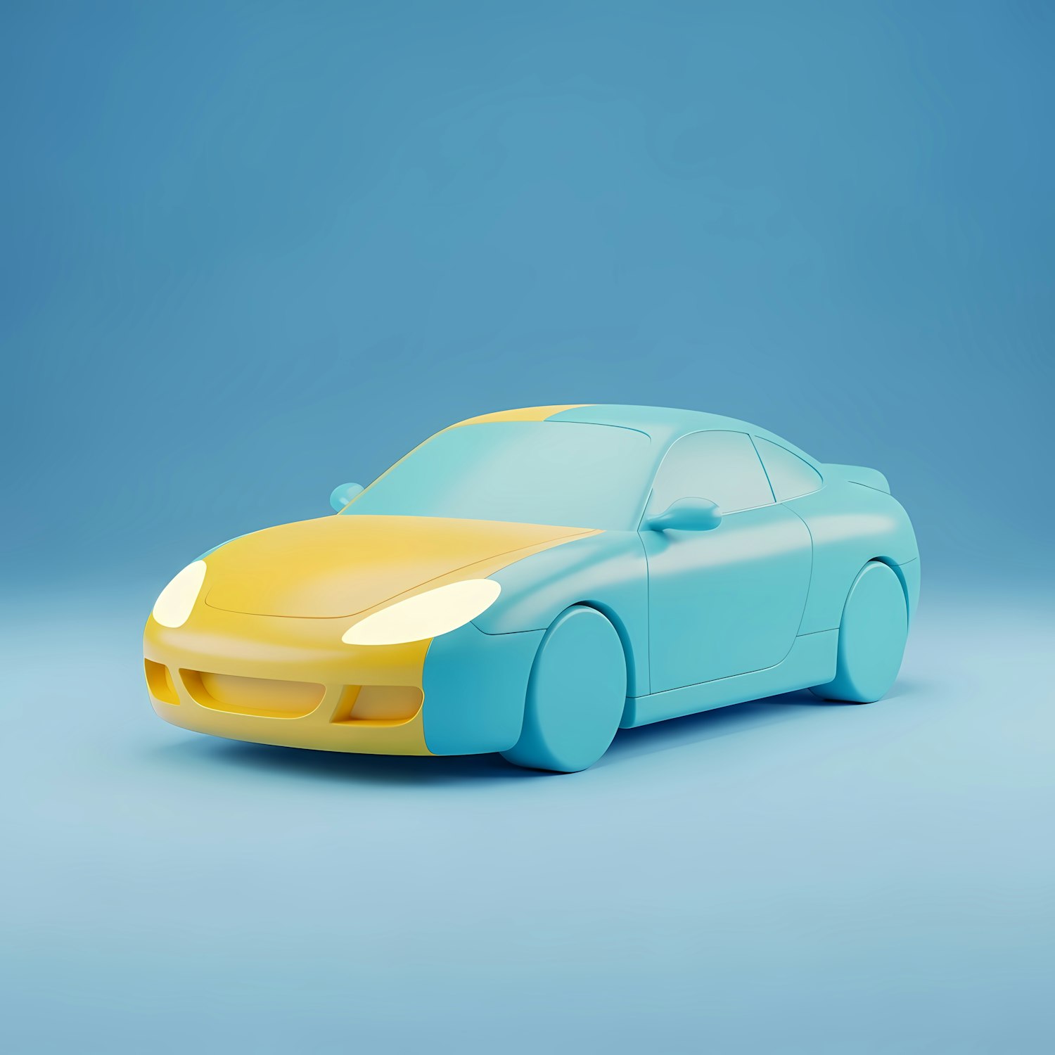 Minimalist 3D rendering of a sleek sports car in light blue and yellow tones, set against a clean blue gradient background.