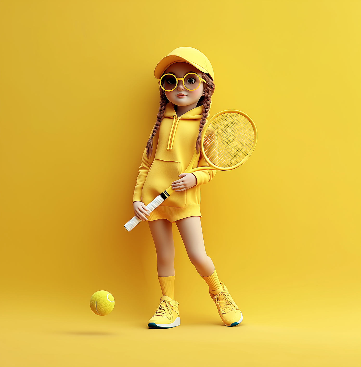 A young girl in all-yellow sports attire with a tennis racket, set against a vibrant yellow background, exudes playful energy.