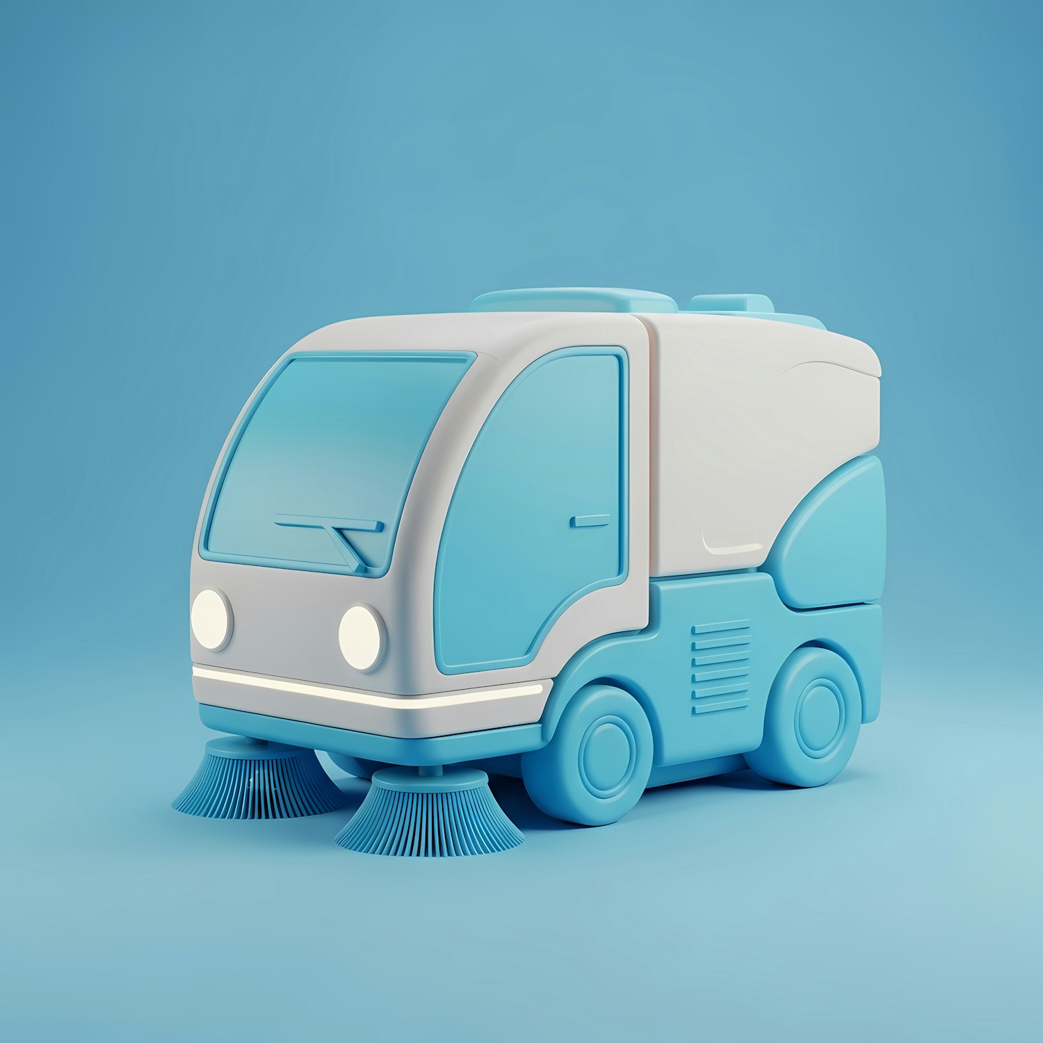 A cute 3D-rendered street sweeper in blue and white, with a modern design and rotating brushes, set against a clean blue background.