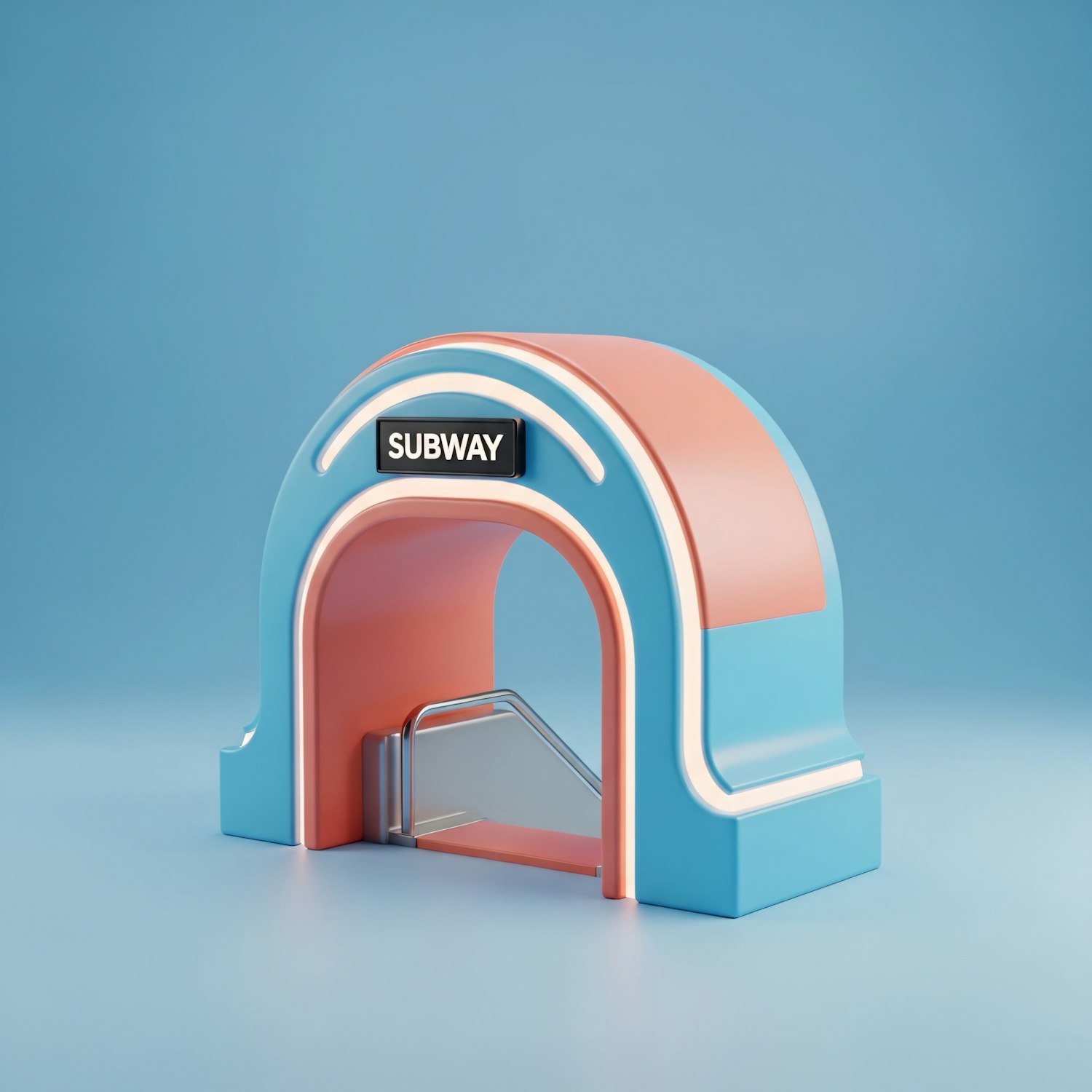 A pastel-colored 3D subway entrance with a modern design, featuring blue and peach tones against a light blue background.