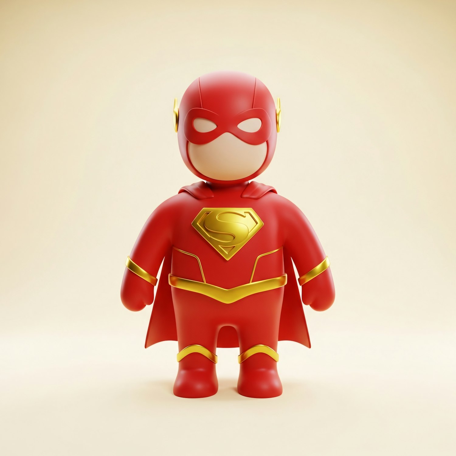 A cute 3D superhero figure in a red and gold suit with a cape, set against a soft beige background.