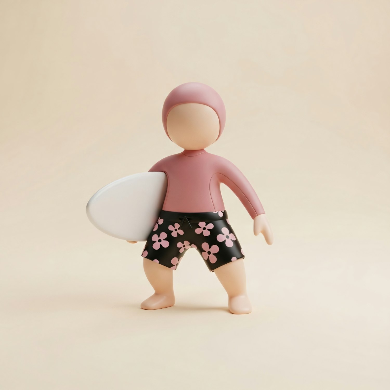 Minimalist 3D character in pink attire holding a surfboard, wearing floral shorts, set against a neutral background.