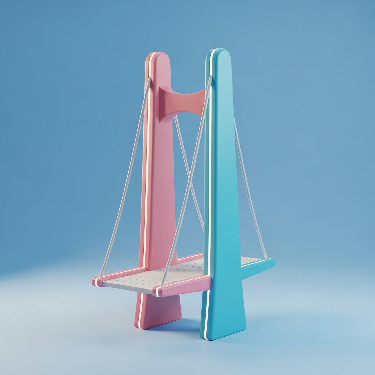 A colorful 3D suspension bridge model with pink and blue towers, white cables, and a light blue background, showcasing modern design.