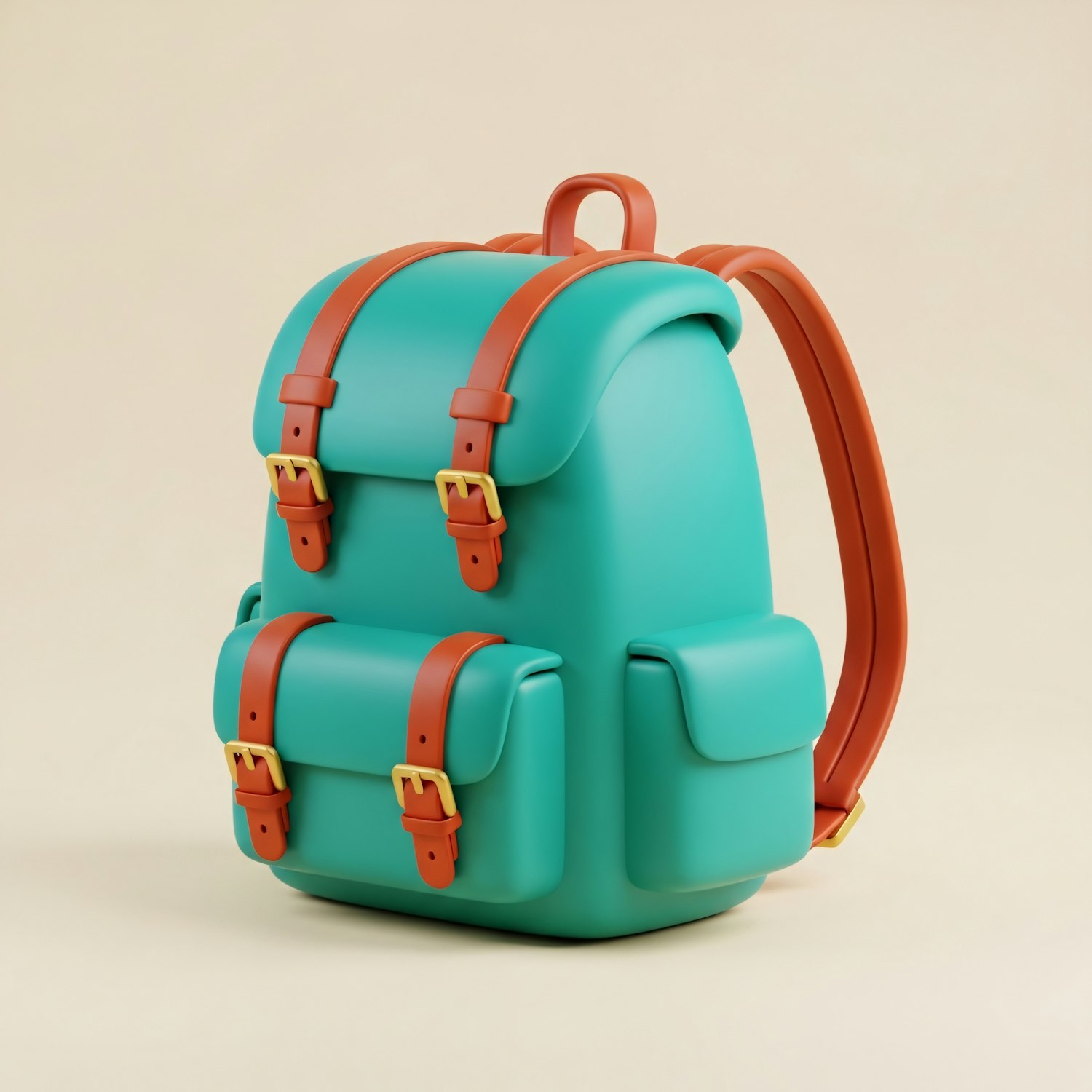 A vibrant teal and orange 3D-rendered backpack with a minimalist design, featuring golden buckles and a smooth matte finish.