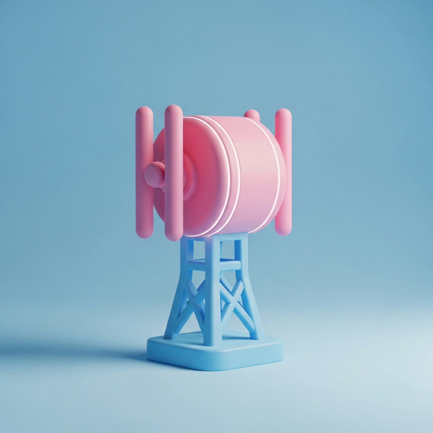 A colorful 3D-rendered communication tower with a playful design, featuring pink and blue tones against a light blue background.
