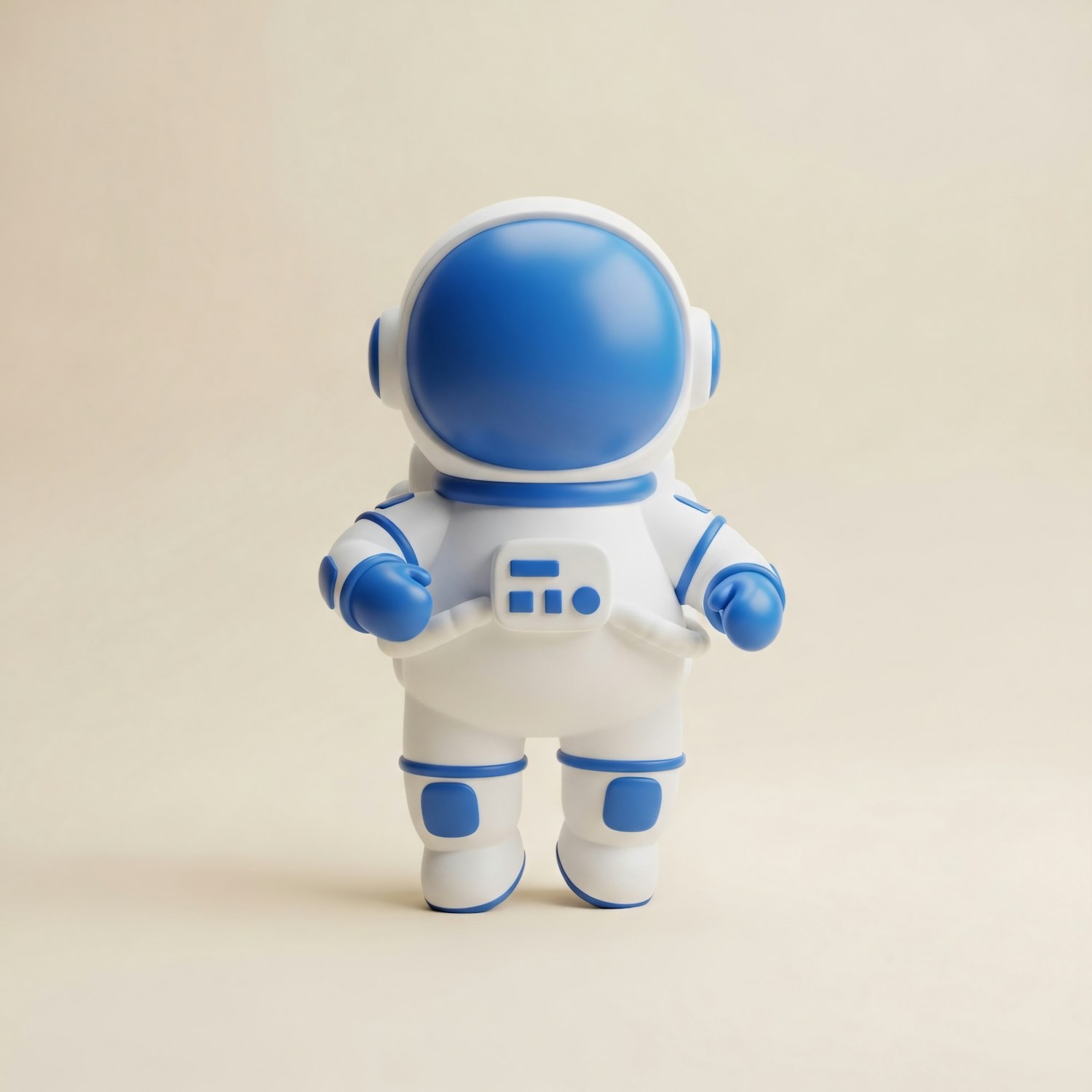 A cute toy astronaut with a white and blue suit stands against a neutral background, showcasing a fun and futuristic design.