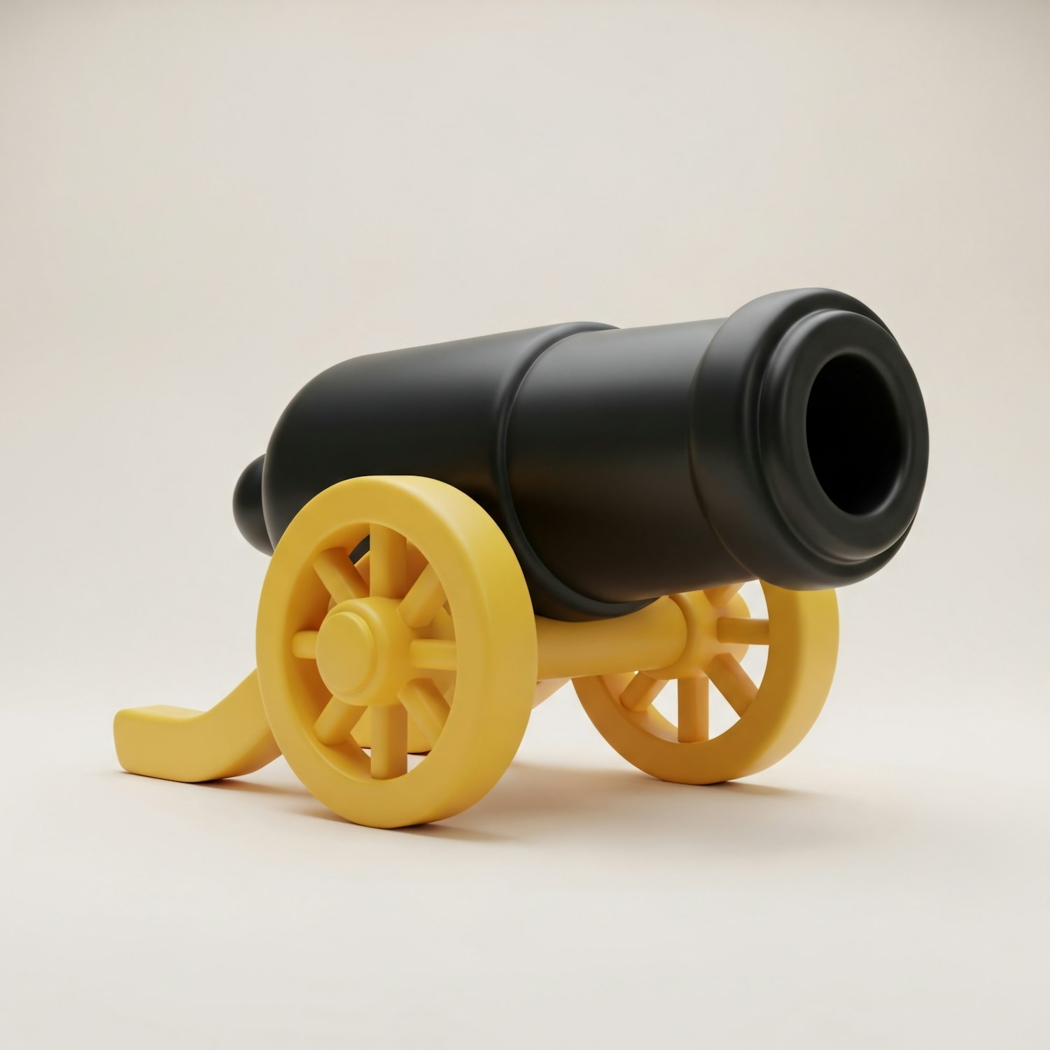 A playful toy cannon with a black barrel and yellow wheels, featuring a smooth and colorful design perfect for children.