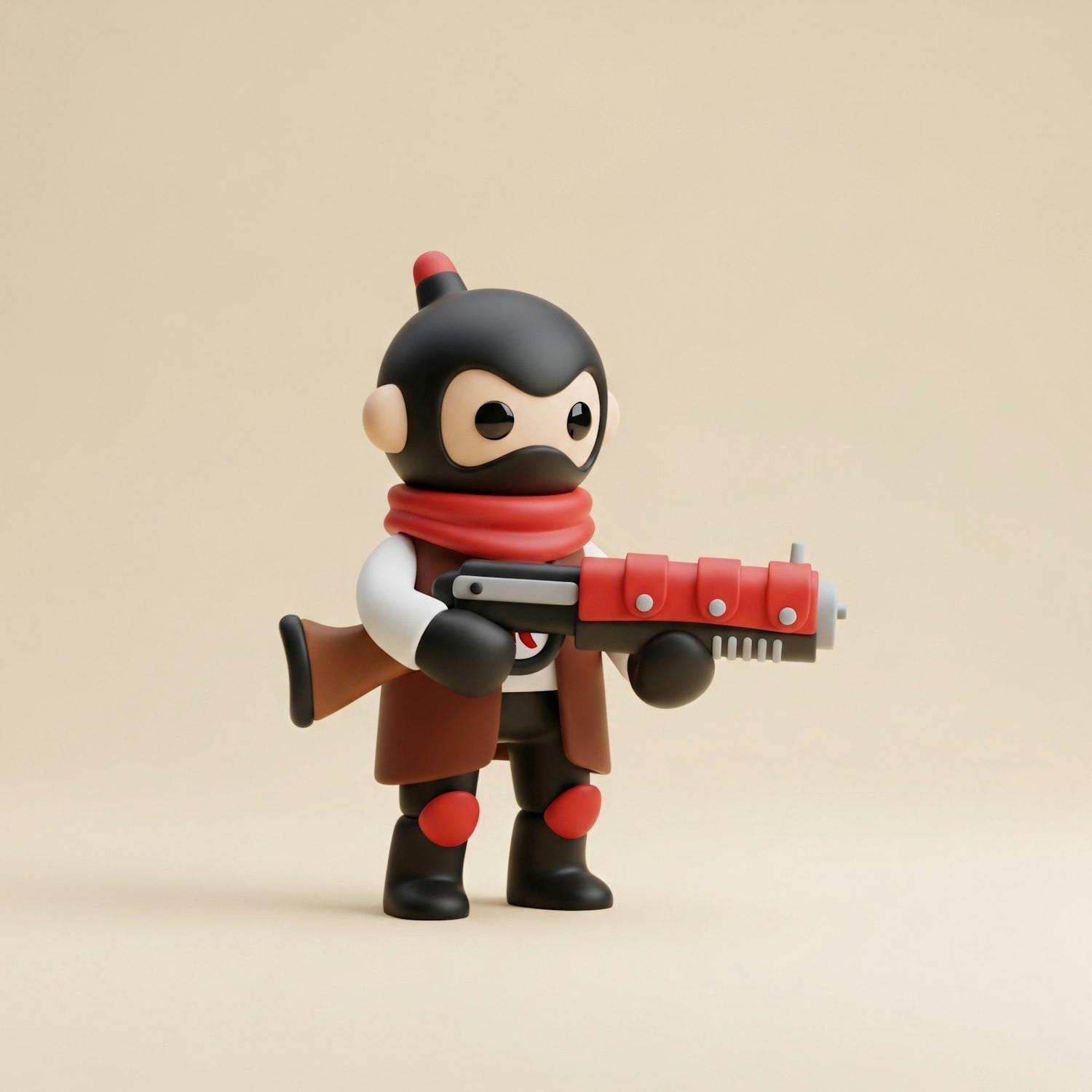 A cute and stylized toy figure with a black and red design, holding a futuristic toy weapon, set against a neutral background.