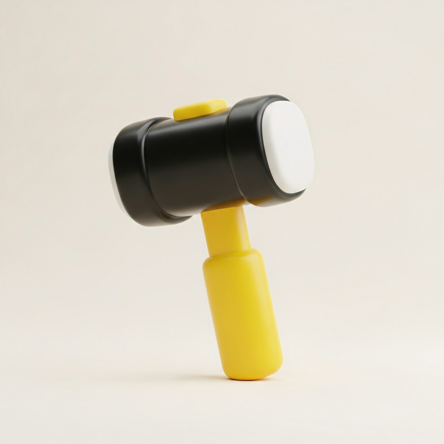 A modern toy hammer with a black head, yellow handle, and white striking surface, displayed on a neutral background.