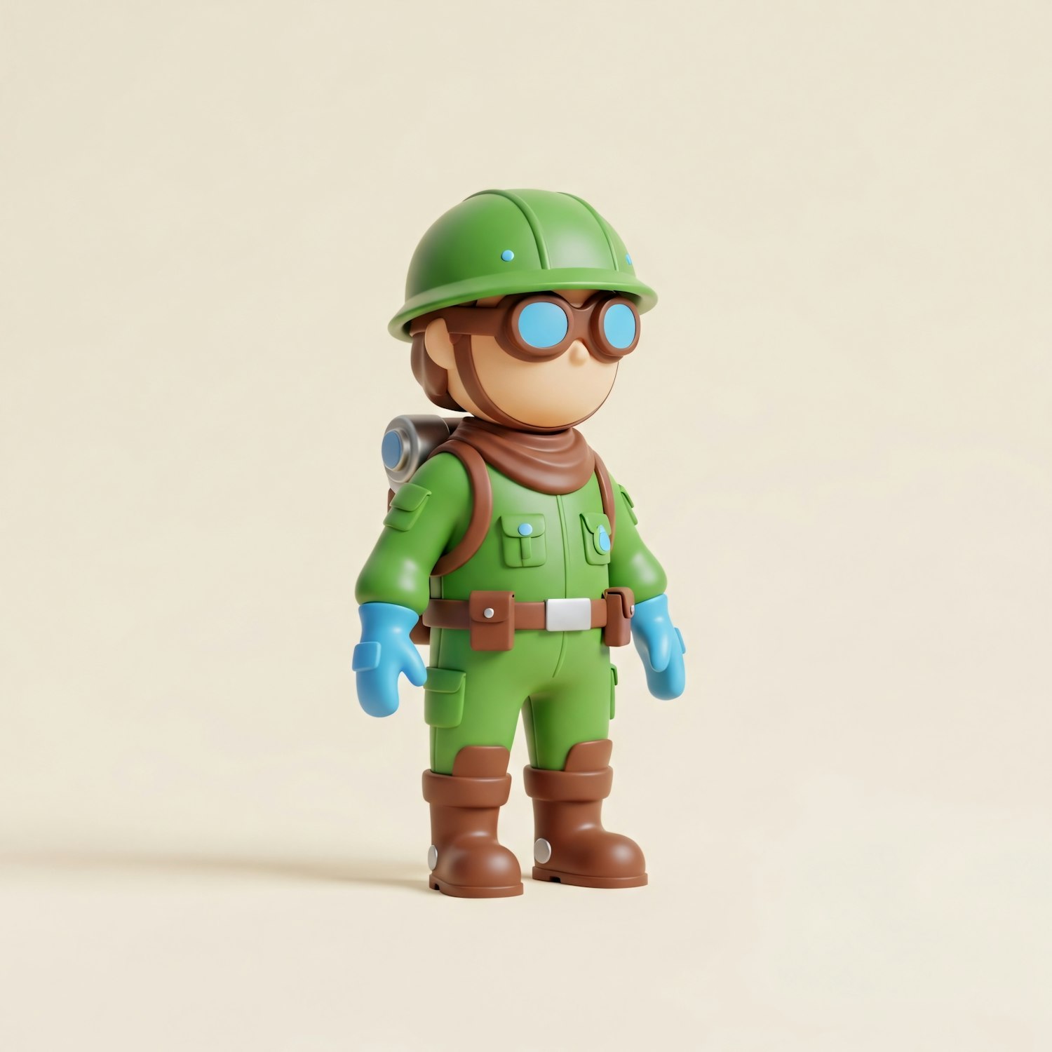 A colorful toy figure in a green uniform with goggles and a backpack, designed with a smooth and vibrant cartoonish style.