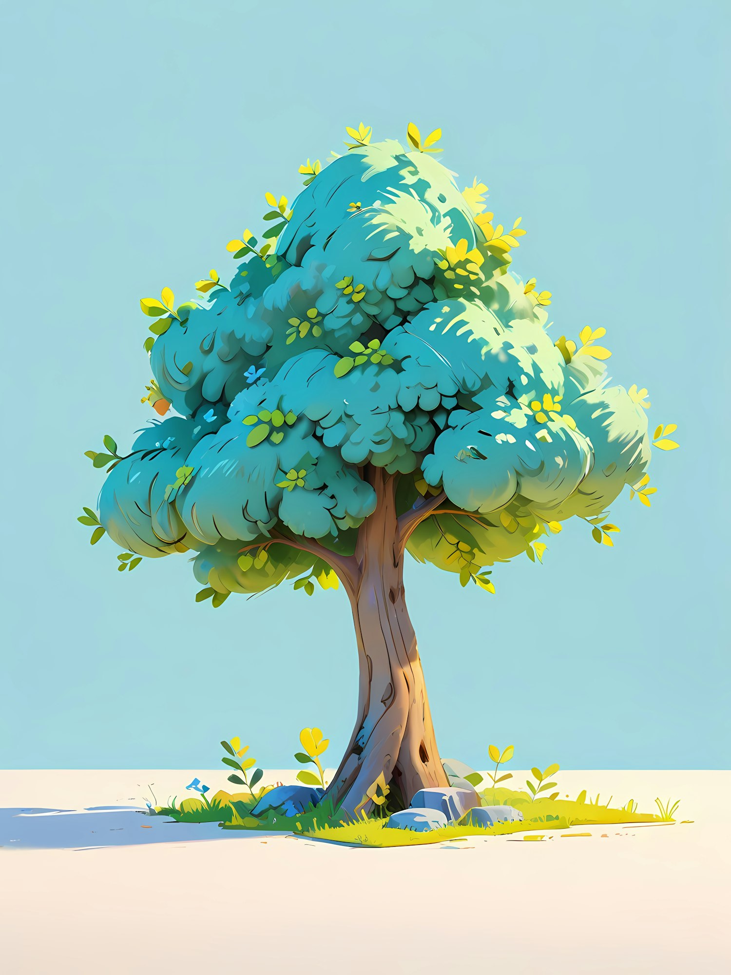 Whimsical illustration of a lush tree with a rounded canopy, surrounded by grass and rocks under a clear blue sky.