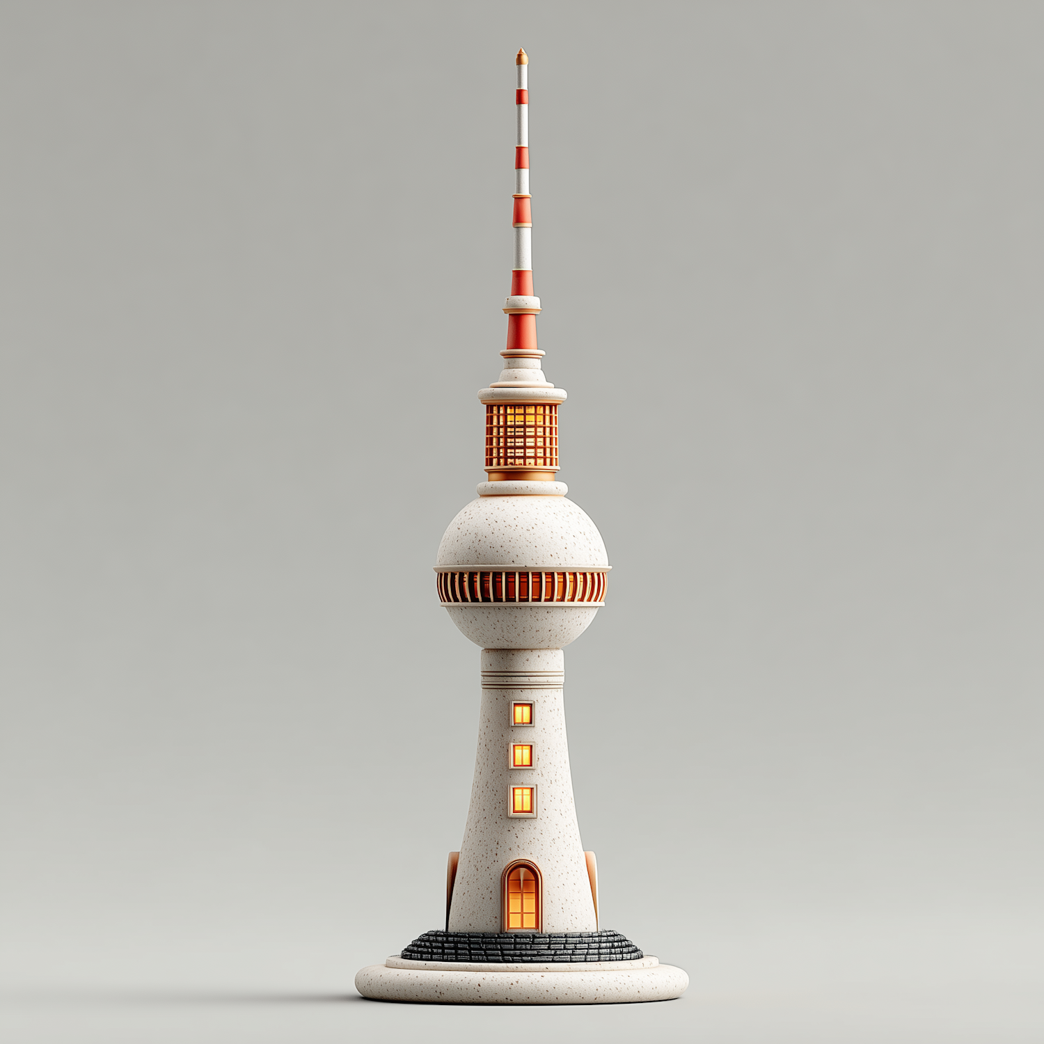 A 3D model of a stylized tower with a spherical observation deck, striped spire, and illuminated windows, set against a plain background.