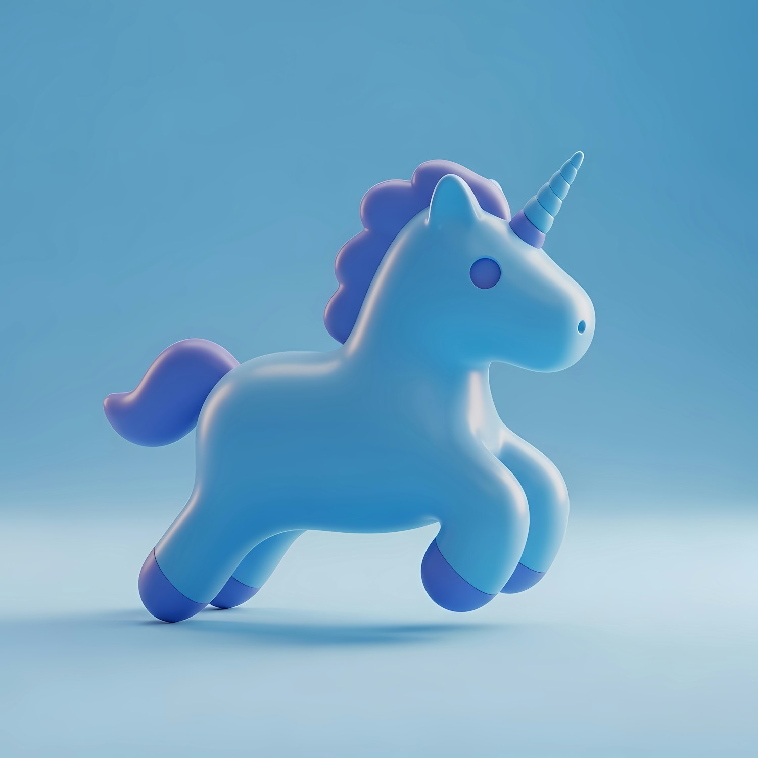 Adorable 3D cartoon unicorn with a blue body and purple accents, set against a soft blue background. Perfect for whimsical designs.