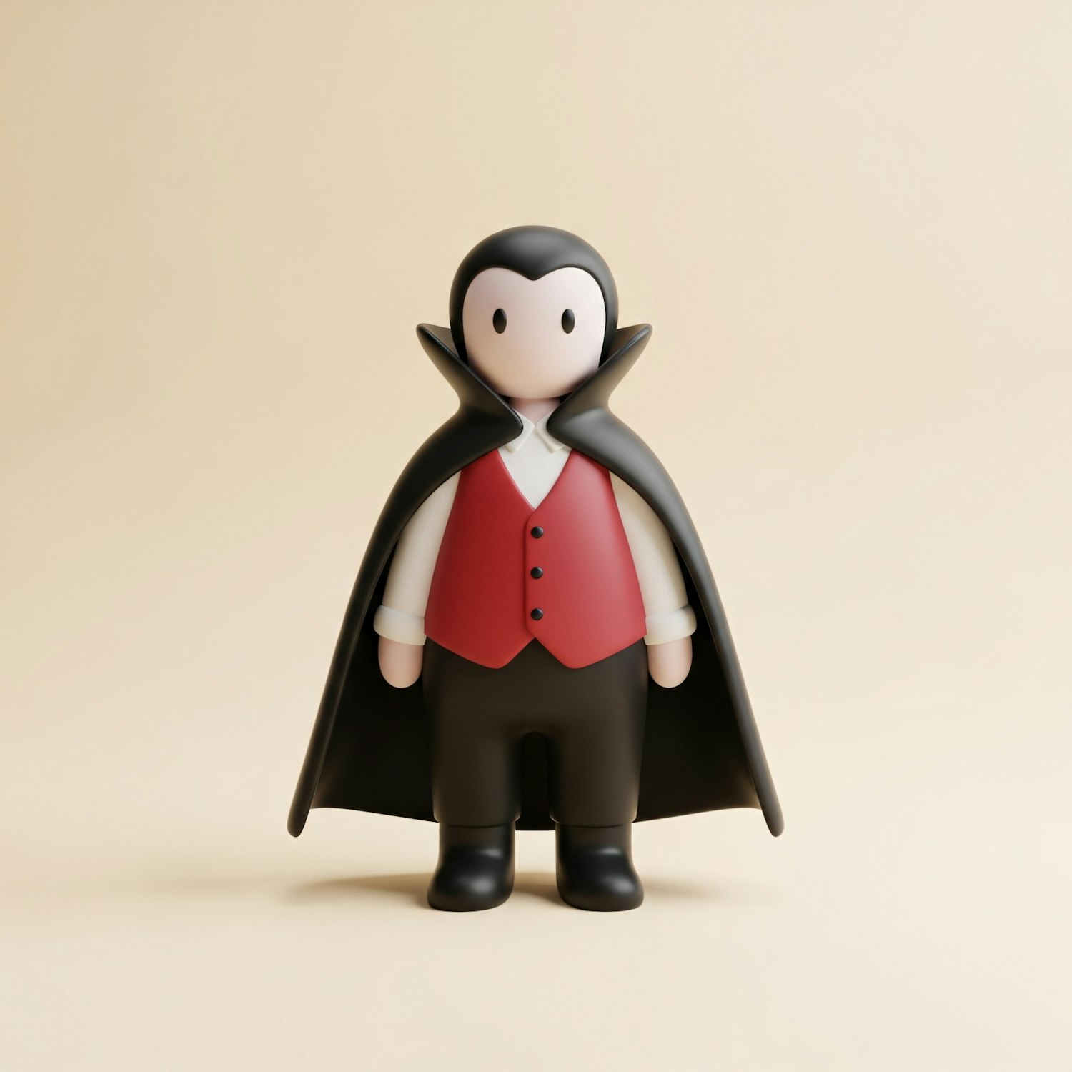 A cute cartoon vampire figure in a red vest and black cape, set against a beige background, showcasing a playful and modern design.